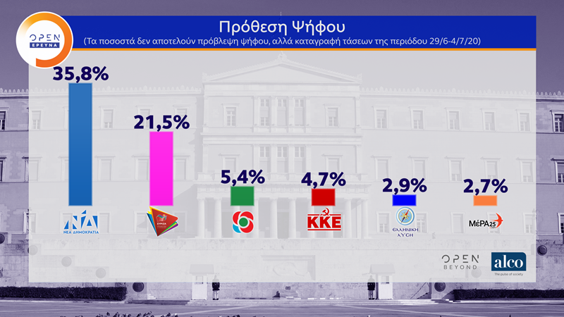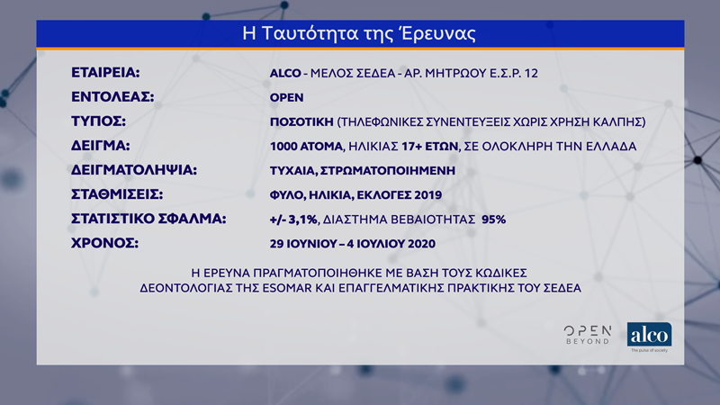 Η μεγάλη δημοσκόπηση του κεντρικού δελτίου Ειδήσεων του OPEN, που διαμορφώθηκε και από ερωτήματα πολιτών, πραγματοποιήθηκε από τις 29 Ιουνίου έως τις 4 Ιουλίου 2020 από την ALCO και μεταδόθηκε τη Δευτέρα 06/07/2020.