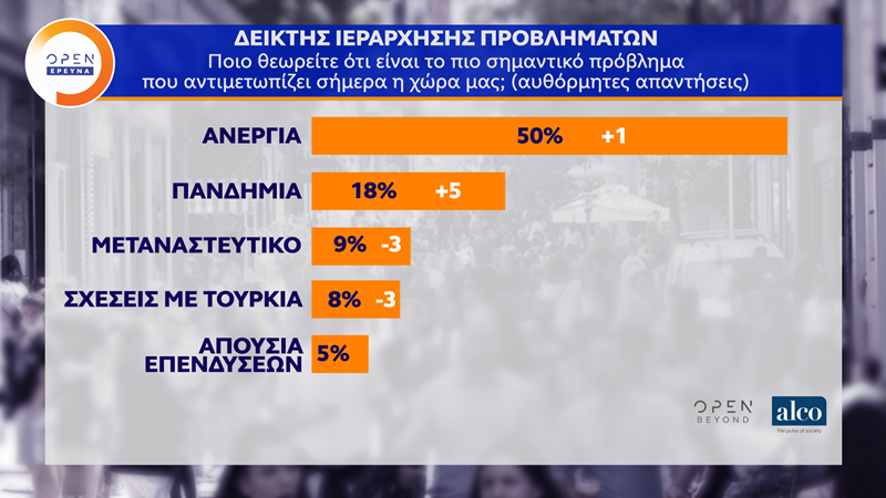 Στο ερώτημα για «το ποιο θεωρείτε ότι είναι το πιο σημαντικό πρόβλημα που αντιμετωπίζει σήμερα η χώρα μας;», το 50% απαντάει ότι είναι η ανεργία. Το 18% εκτιμά ότι είναι η πανδημία του κορονοϊού, το 9% απαντάει ότι είναι το μεταναστευτικό. Το 8% οι σχέσεις με την Τουρκία, το 5% η απουσία επενδύσεων, το 4% η υψηλή φορολογία, η υγεία, η παιδεία και άλλο από 2%.