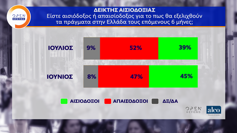 Στο ερώτημα για το εάν είστε αισιόδοξος ή απαισιόδοξος για το πώς θα εξελιχθούν τα πράγματα στην Ελλάδα τους επόμενους έξι μήνες το 39%, εκφράζει αισιοδοξία ενώ το 52% απαισιοδοξία.