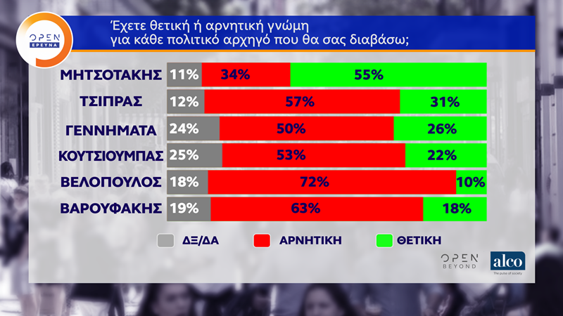 Στο ερώτημα που αφορά τις θετικές και αρνητικές γνώμες των πολιτών σχετικά με τους πολιτικούς αρχηγούς ο πρωθυπουργός Κυριάκος Μητσοτάκης συγκεντρώνει 55% θετικές γνώμες, ενώ το 34% έχει αρνητική άποψη. Ο Αλέξης Τσίπρας λαμβάνει 31% θετικές γνώμες και 57% αρνητικές. Η Φώφη Γεννηματά λαμβάνει 26% θετικές γνώμες και 50% αρνητικές, ο Δημήτρης Κουτσούμπας 22% θετικές γνώμες και 53% αρνητικές. Ο Κυριάκος Βελόπουλος 10% θετικές γνώμες και 72% αρνητικές. Τέλος ο Γιάνης Βαρουφάκης λαμβάνει 18% θετικές γνώμες και 63% αρνητικές.