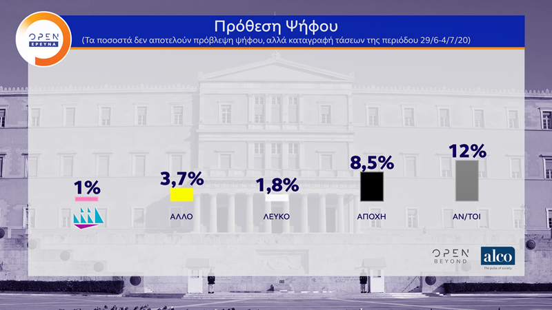 Η δημοσκόπηση, που έγινε για λογαριασμό της τηλεόρασης του Open, πραγματοποιήθηκε σε δείγμα 1.000 ατόμων στο διάστημα 29 Ιουνίου – 4 Ιουλίου 2020.