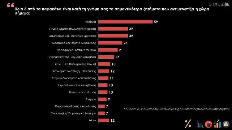 Στη μεγάλη εικόνα, το σημαντικότερο πρόβλημα που αντιμετωπίζει η χώρα είναι η ακρίβεια και δευτερευόντως τα εθνικά θέματα, οι χαμηλοί μισθοί, οι συνθήκες εργασίες, καθώς και τα ζητήματα διαφθοράς και διαφάνειας.