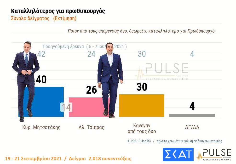 Οι ερωτηθέντες θεωρούν ως καταλληλότερο για πρωθυπουργό τον Κυριάκο Μητσοτάκη με 40% (έναντι 42% στην προηγούμενη έρευνα στις 5 – 7 Ιουλίου) ενώ τον Αλέξη Τσίπρα το 26% (24% στην προηγούμενη έρευνα).