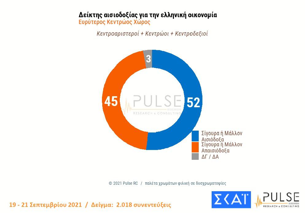 Σε ό,τι αφορά το δείκτη αισιοδοξίας για την πορεία της οικονομίας στον ευρύτερο κεντρώο χώρο, το 52% των κεντροδεξιών αισθάνονται σίγουρα ή μάλλον αισιόδοξα για την οικονομία, ενώ το 45% των κεντροαριστερών αισθάνονται σίγουρα ή μάλλον απαισιόδοξα.