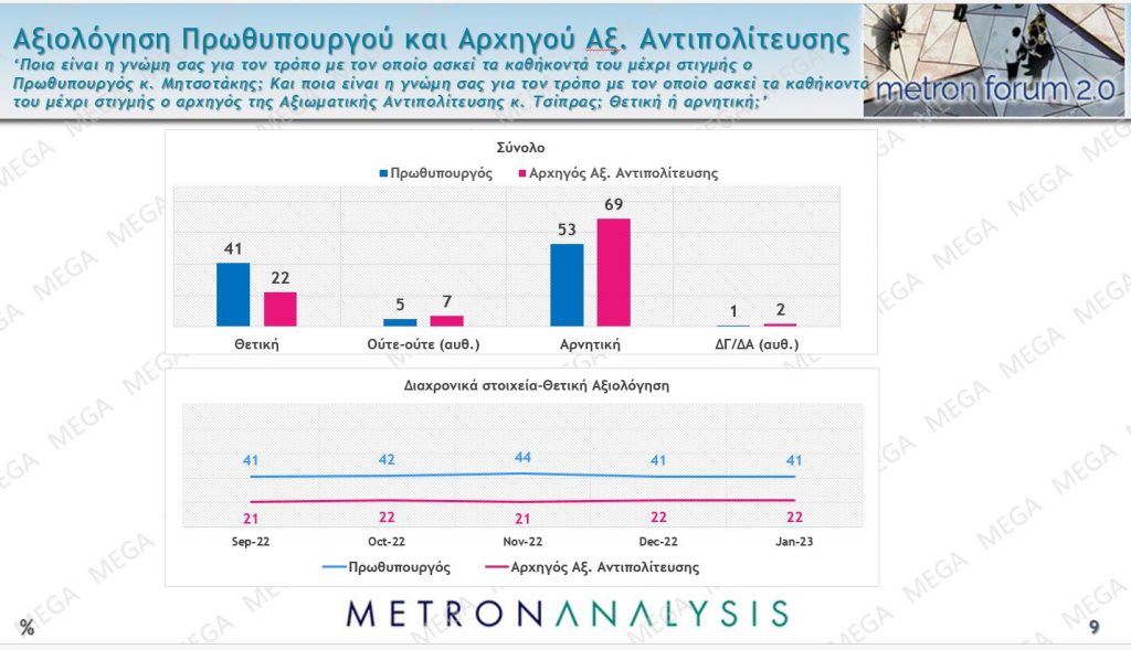 Ο πρωθυπουργός αξιολογείται θετικά από το 41% (πάνω από την κυβέρνηση δηλαδή) και 53% αρνητικά.
