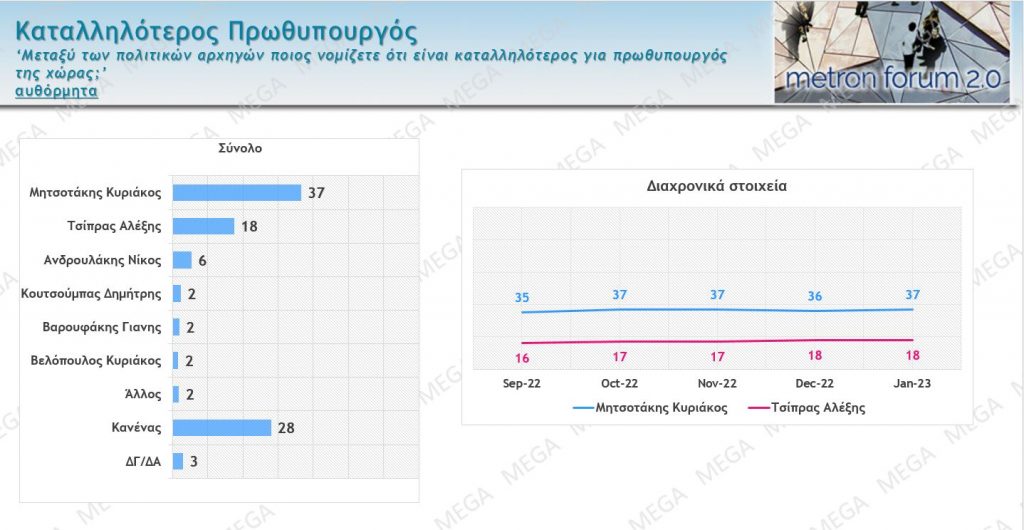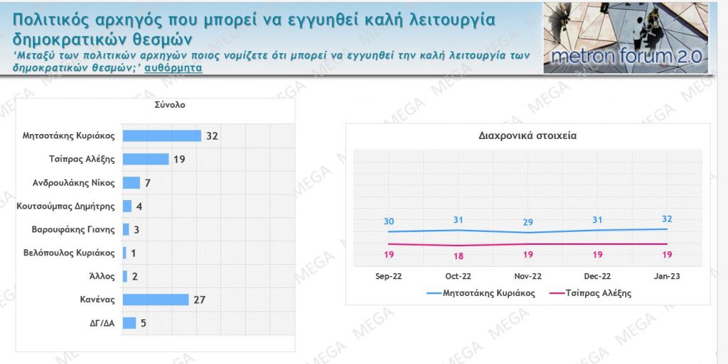 Ο νυν πρωθυπουργός θεωρείται πιο κατάλληλος να εγγυηθεί την καλή λειτουργία των θεσμών με 32%, ο Τσίπρας με 19% και ο Ανδρουλάκης με 7%.