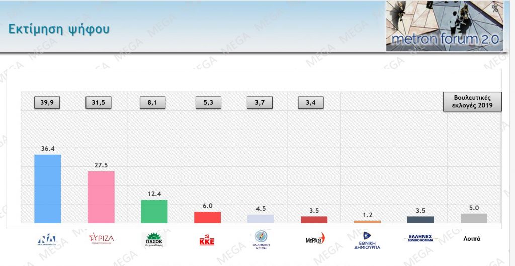 Προβάδισμα της Νέας Δημοκρατίας έναντι του ΣΥΡΙΖΑ με 7 μονάδες, δίνει η νέα δημοσκόπηση της Metron Analysis που παρουσιάστηκε στο κεντρικό δελτίο ειδήσεων «Mega Γεγονότα» με τη Ράνια Τζίμα.