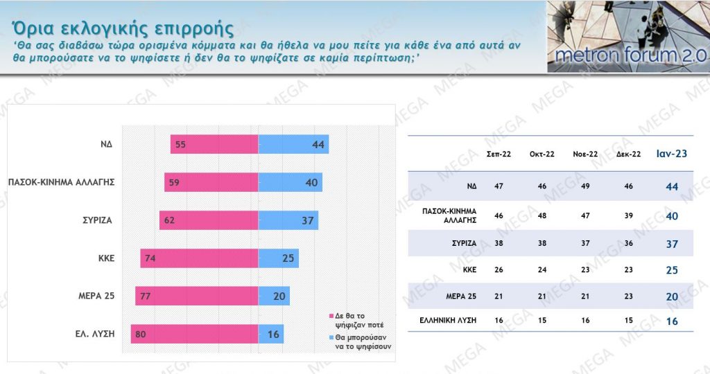 Τα όρια εκλογικής επιρροής, αν δηλαδή θα ψήφιζαν ή σε καμιά περίπτωση τα κόμματα, η ΝΔ παίρνει ποσοστό 44% όσων λένε ότι θα μπορούσαν να την ψηφίσουν (46% τον Δεκέμβριο, 49% το Νοέμβριο). Ένα 55% λέει ότι δεν θα ψήφιζε ΝΔ σε καμιά περίπτωση.