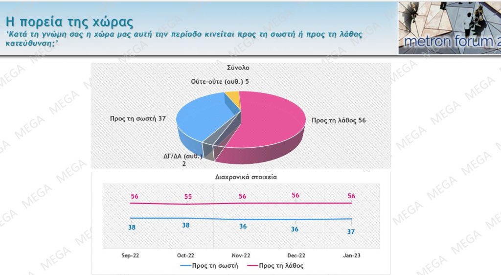 Το 56% των ερωτηθέντων λέει ότι η χώρα κινείται προς τη λάθος κατεύθυνση και το 37% προς τη σωστή, ποσοστά περίπου ίδια με τον προηγούμενο μήνα.