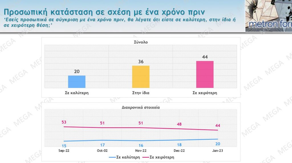 · Το 44% λέει ότι η προσωπική του κατάσταση σε σχέση με πριν ένα χρόνο είναι χειρότερη και το 36% ίδια. Μόλις 20% ότι είναι καλύτερη.
