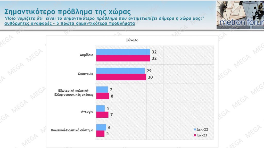 · Η ακρίβεια παραμένει σταθερά πρώτο πρόβλημα της χώρας με 32%. Ακολουθεί γενικότερα η οικονομία με 30%, η εξωτερική πολιτική – Ελληνοτουρκικά με 8%, η ανεργία με 7%, το πολιτικό σύστημα – πολιτικοί με 5%.