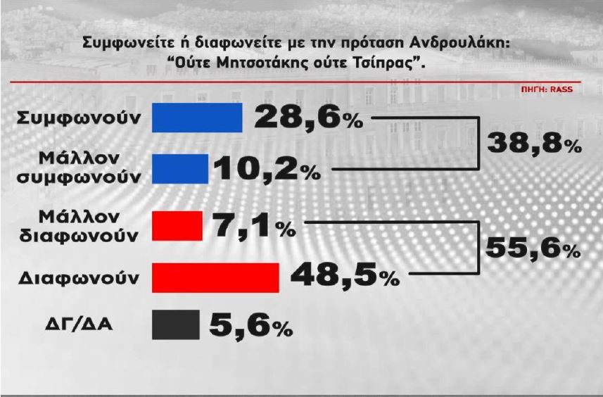 Για την πρόταση Ανδρουλάκη «Ούτε Μητσοτάκης, ούτε Τσίπρας» το 55,6% διαφωνεί, ενώ θετικά τη βλέπει το 38,8%.