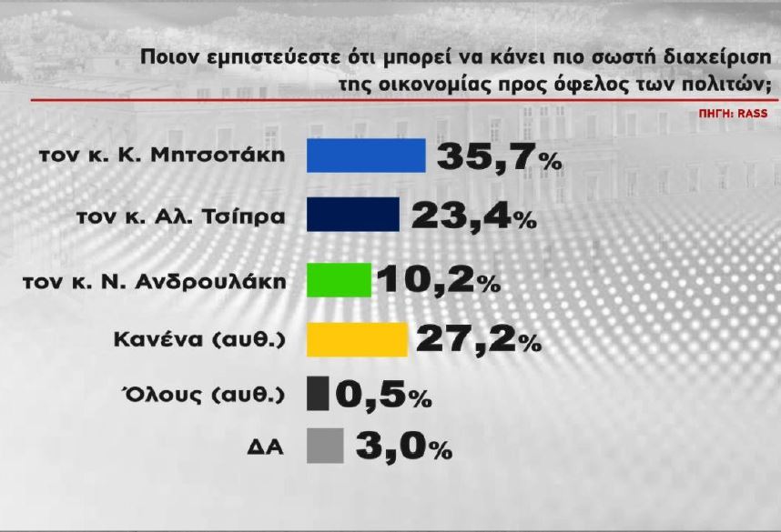 Στο ερώτημα «ποιον εμπιστεύεστε ότι μπορεί να κάνει πιο σωστή διαχείριση της οικονομίας προς όφελος των πολιτών, το 37,5% λέει ο Κ. Μητσοτάκης, το 23,4% ο Αλέξης Τσίπρας, το 10.2% ο Νίκος Ανδρουλάκης.