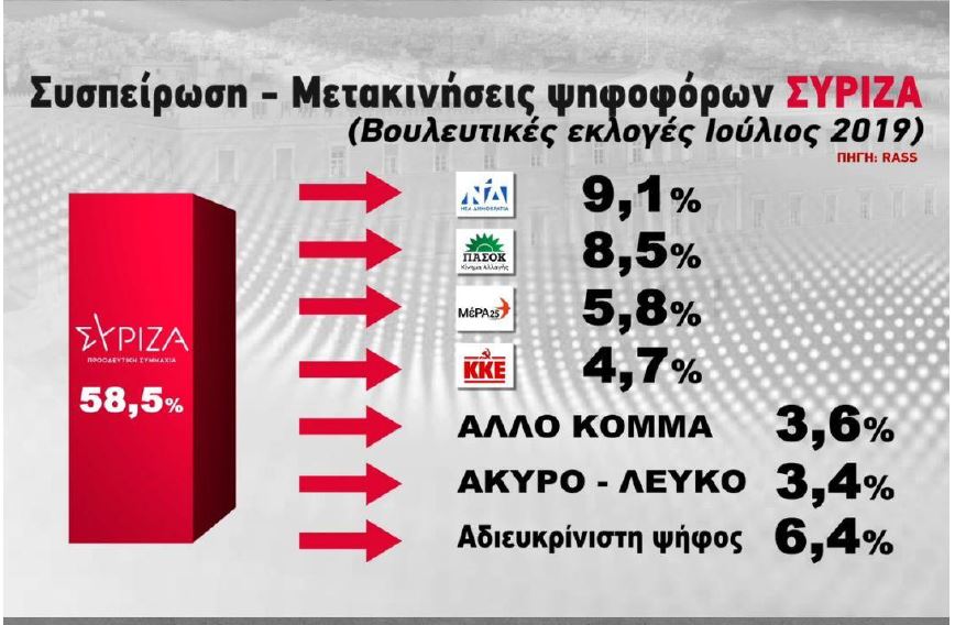 Πολλή χαμηλή και με μεγάλα περιθώρια βελτίωσης, είναι η συσπείρωση του ΣΥΡΙΖΑ, μόλις στο 58,5% με το 9,1% να πηγαίνει προς τη ΝΔ, το 8,5% προς το ΠΑΣΟΚ, το 5,8% προς το ΜέΡΑ 25.