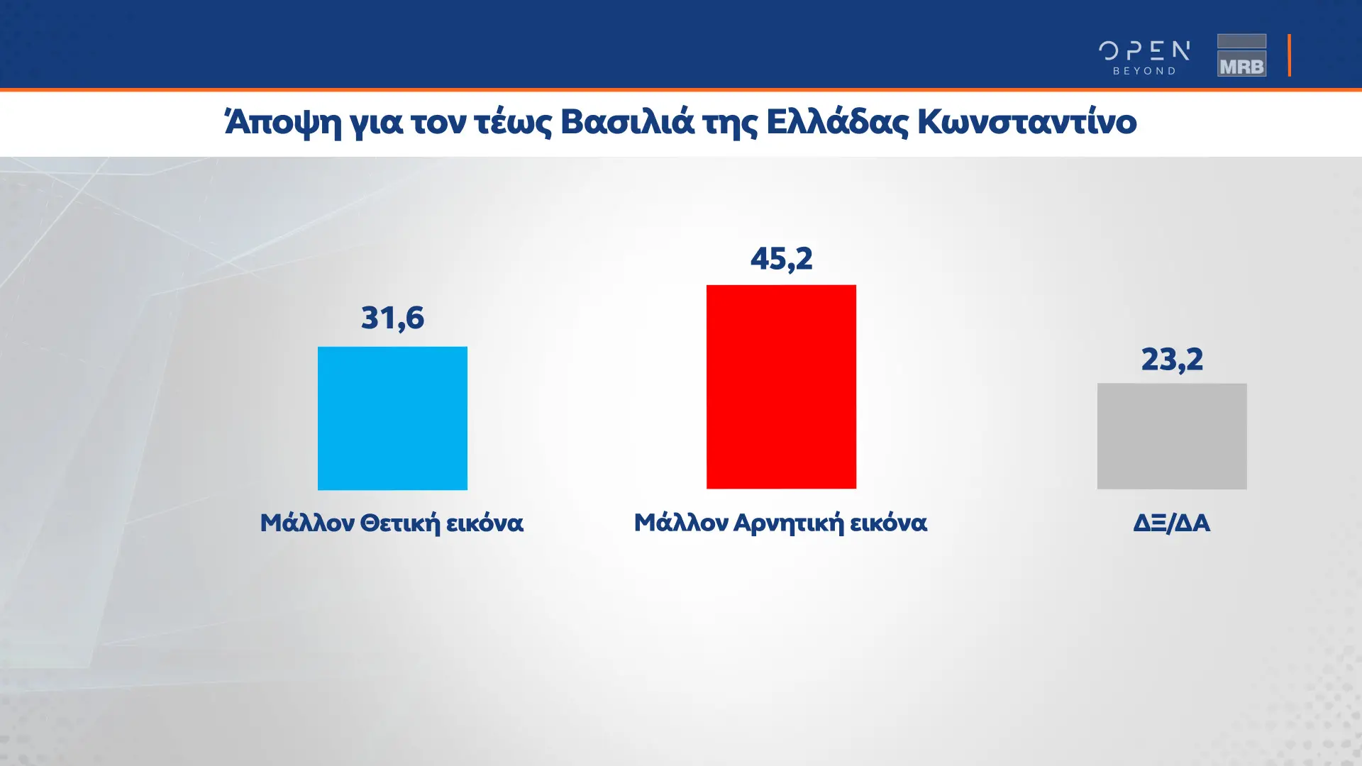 Παράλληλα οι ερωτηθέντες σε ποσοστό 45,2% έχουν αρνητική εικόνα για τον Κωνσταντίνο Γλύξμπουργκ, ενώ το 31,6% θετική εικόνα. Το 23,2% απαντά πως δεν ξέρει.