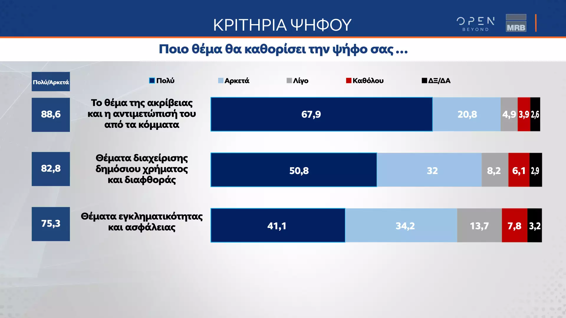Εξάλλου οι πολίτες σε ποσοστό 88,6% απαντάνε πως θα ψηφίσουν με κριτήριο το θέμα της ακρίβειας, το 82,8% με κριτήριο τη διαχείριση του δημόσιου χρήματος και την αντιμετώπιση της διαφθοράς, το 75,3% με κριτήριο τα θέματα εγκληματικότητας και ασφάλειας, το 73,3% με κριτήριο τα ελληνοτουρκικά και την αντιμετώπιση των διμερών θεμάτων και το 51,3% με κριτήριο το θέμα των υποκλοπών.