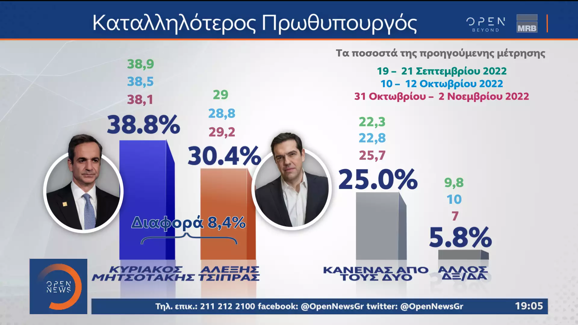 Σύμφωνα με δημοσκόπηση της MRB για λογαριασμό του OPEN η ΝΔ προηγείται 6,4 ποσοστιαίες μονάδες του ΣΥΡΙΖΑ. Καταλληλότερος για πρωθυπουργός εμφανίζεται ο Κυριάκος Μητσοτάκης.