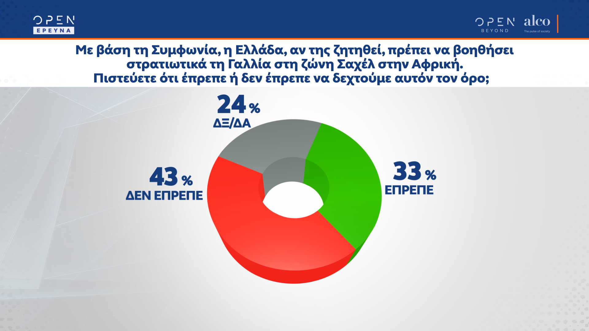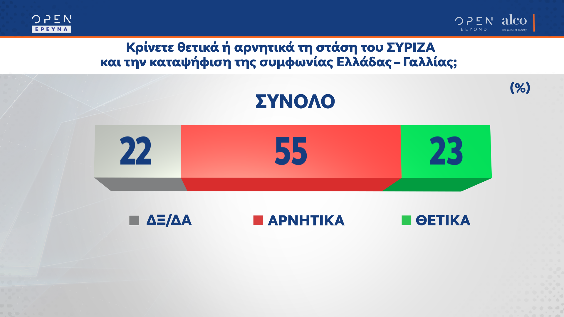 Μεγάλη αποδοχή και επικρότηση είχε η ελληνογαλλική συμφωνία όπως έδειξε και η δημοσκόπηση του κεντρικού δελτίου Ειδήσεων του OPEN, που διαμορφώθηκε και από ερωτήματα πολιτών, πραγματοποιήθηκε από τις 11 έως τις 16 Οκτωβρίου 2021 από την ALCO και μεταδόθηκε τη Δευτέρα 18/10/2021.