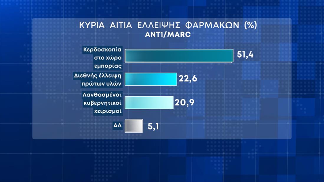 Οι απόψεις των πολιτών για τα αίτια των ελλείψεων στα φάρμακα, είναι για τους 5 στους 10 η κερδοσκοπία στον χώρο της εμπορίας, ενώ στη δεύτερη θέση είναι η Διεθνής έλλειψη πρώτων υλών.