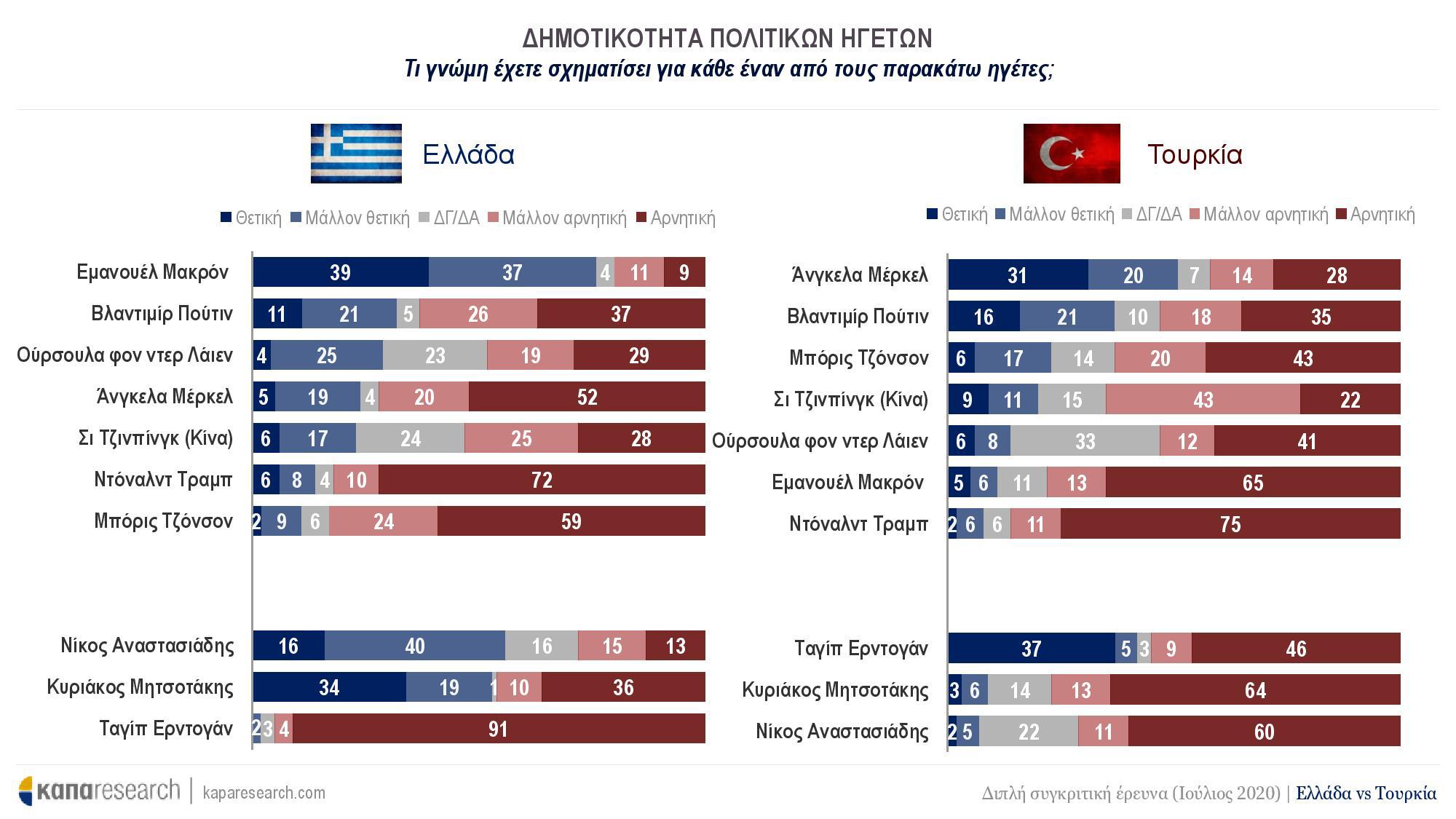 Τέλος, είναι ιδιαιτέρως χαρακτηριστικό ότι στην Τουρκία η Άνγκελα Μέρκελ με 51% θετικές γνώμες (vs 24% στην Ελλάδα) είναι ο δημοφιλέστερος ξένος ηγέτης ενώ, αντίστοιχα, στην Ελλάδα την πρώτη θέση καταλαμβάνει ο Εμανουέλ Μακρόν με 76% (vs μόλις 11% στην Τουρκία).