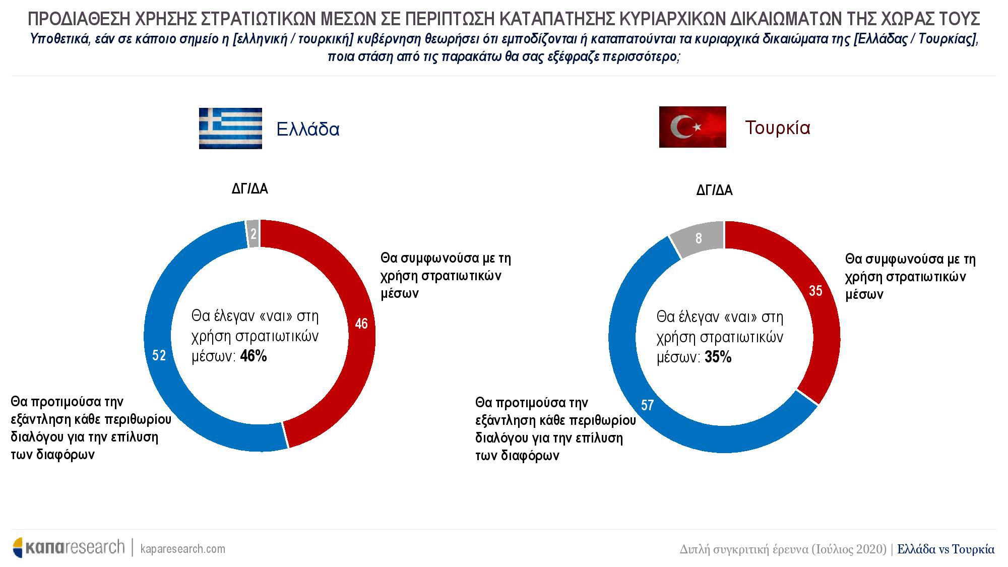 Στο υποθετικό σενάριο, που τα πράγματα εκτραχυνθούν και εάν σε κάποιο σημείο η [ελληνική/τουρκική] κυβέρνηση θεωρήσει ότι εμποδίζονται ή καταπατούνται τα κυριαρχικά δικαιώματα της [Ελλάδας/Τουρκίας] και οι δύο λαοί επιθυμούν να εξαντληθούν οι πιθανότητες διαλόγου. Όμως οι κάτοικοι της Ελλάδας παρουσιάζονται πιο έτοιμοι για την επέμβαση του στρατού (46%) από ότι αυτοί της Τουρκίας (35%).