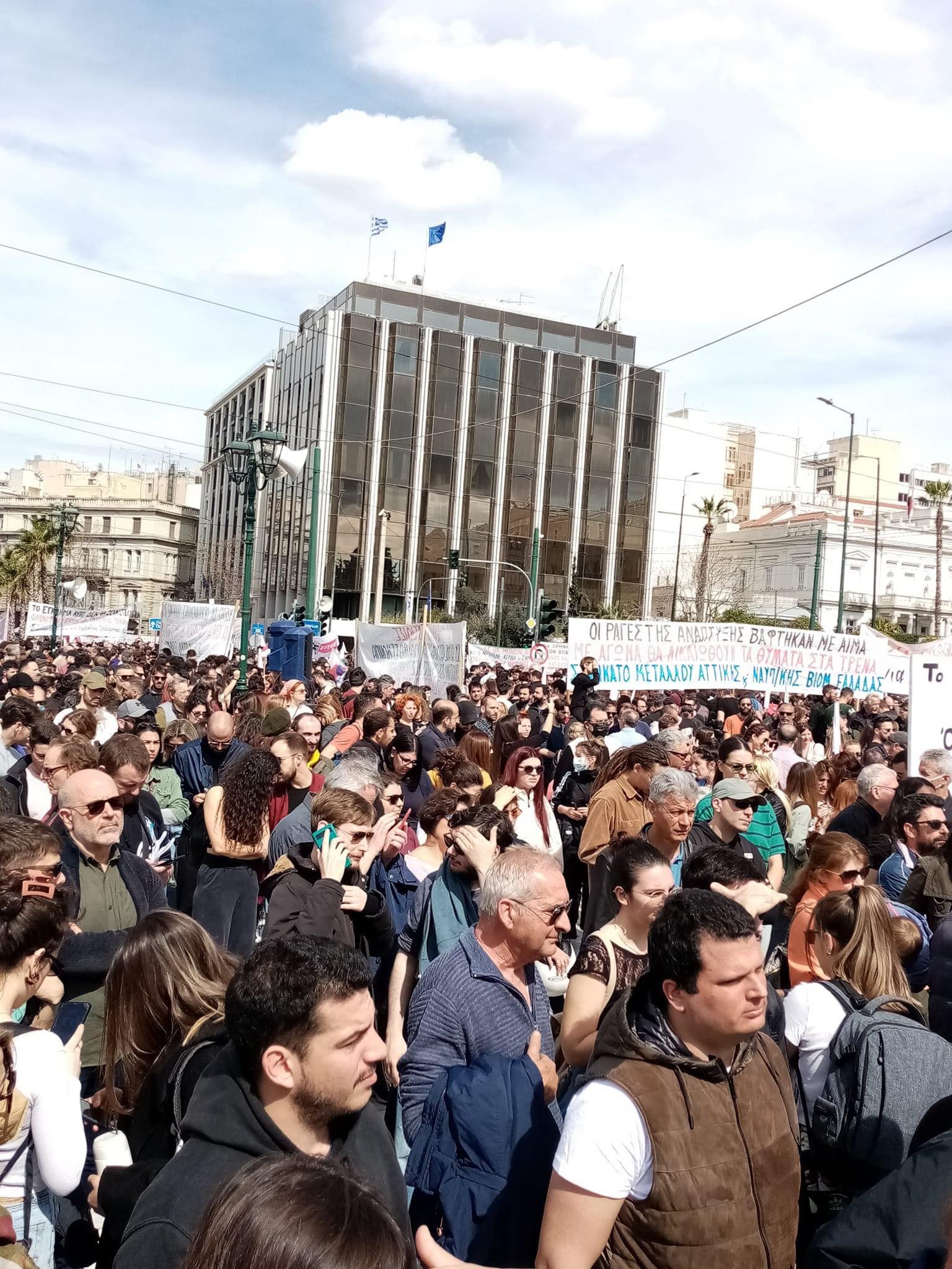 Το συλλαλητήριο ξεκίνησε με χαιρετισμό του Παναγιώτη Μπούρου, μηχανοδηγού της «Hellenic Train», ο οποίος χαιρέτισε τις μεγάλες κινητοποιήσεις που «σπάνε το κυβερνητικό αφήγημα για το «ανθρώπινο λάθος» αναφέροντας: «Χρέος στους νεκρούς μας η θλίψη και η οργή να γίνει ποτάμι και να τους πνίξει».