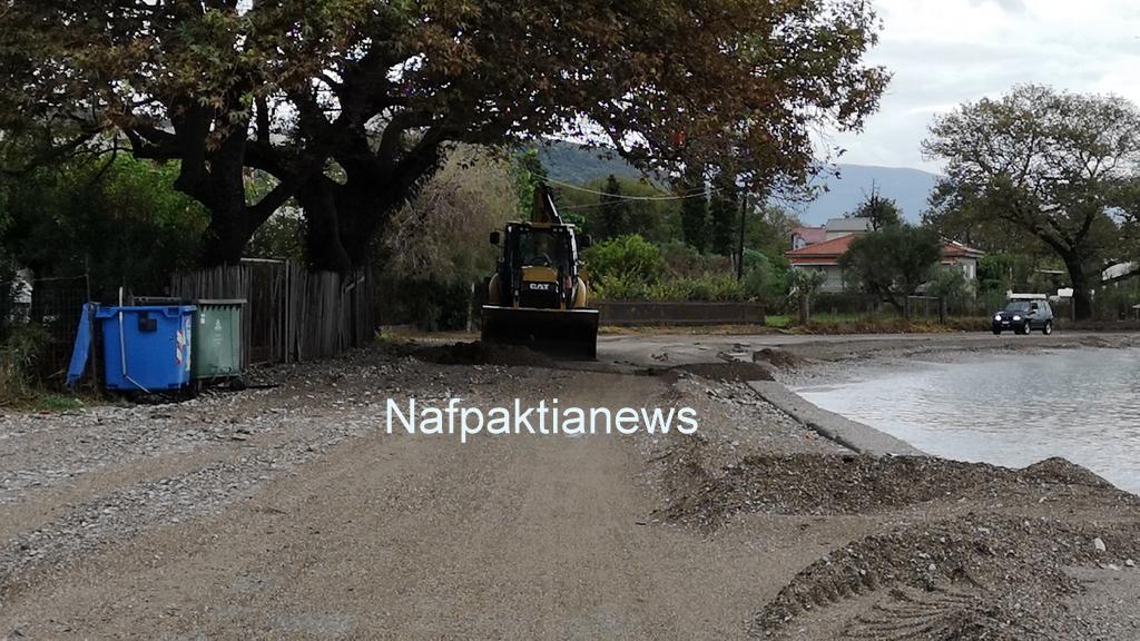 Μέχρι αυτή τη στιγμή επιχειρεί μηχάνημα έργου (jcb) του δήμου Ναυπακτίας, στο δρόμο προκειμένου να απομακρύνει τα χώματα από το οδόστρωμα και να κρατήσει ανοιχτές τις απορροές των ομβρίων που καταλήγουν στη θάλασσα. Ο ασφαλτοτάπητας σε πολλά σημεία του δρόμου έχει αποκολληθεί, λόγω των κυμάτων, ενώ σε επιφυλακή βρίσκεται το σύνολο του προσωπικού της πολιτικής προστασίας και του μηχανολογικού εξοπλισμού του δήμου προκειμένου να επεμβαίνουν άμεσα όταν και όπου χρειαστεί.