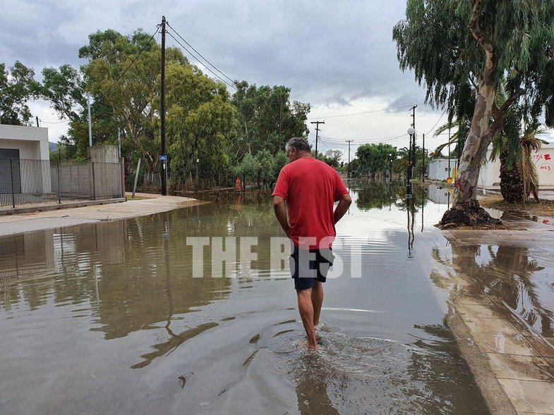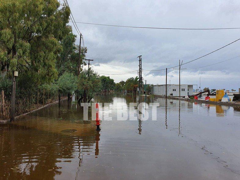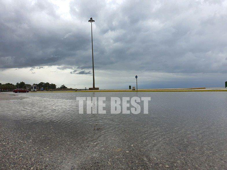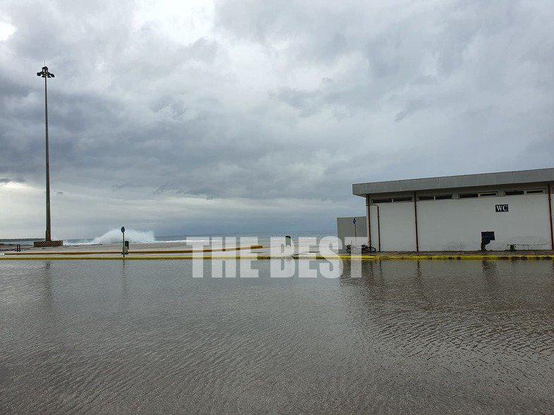 Ειδικά στην οδό Ποσειδώνος το νερό είναι μέχρι το γόνατο. Η θάλασσα έχει βγει έξω και έχει καλύψει ολόκληρο το παρκινγκ των οχημάτων. Ο άνεμος προκάλεσε ζημιές σε ομπρέλες παραθαλάσσιων καταστημάτων ενώ ο παραλιακός δρόμος έχει γεμίσει με πέτρες και ξύλα και παραμένει κλειστός.