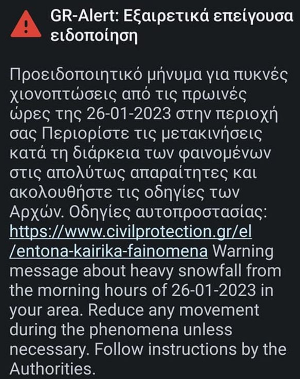 Το μήνυμα προειδοποιεί για χιονοπτώσεις από αύριο το πρωί