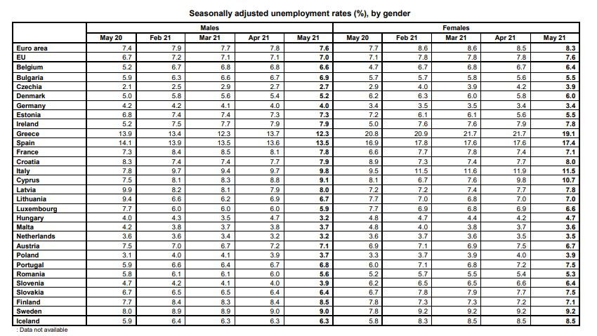 Στη ζώνη του ευρώ, το ποσοστό ανεργίας για τις γυναίκες μειώθηκε από 8,5% τον Απρίλιο του 2021 σε 8,3% το Μάιο του 2021 ενώ το ποσοστό για τους άνδρες μειώθηκε από 7,8% τον Απρίλιο του 2021 σε 7,6% το Μάιο του 2021.