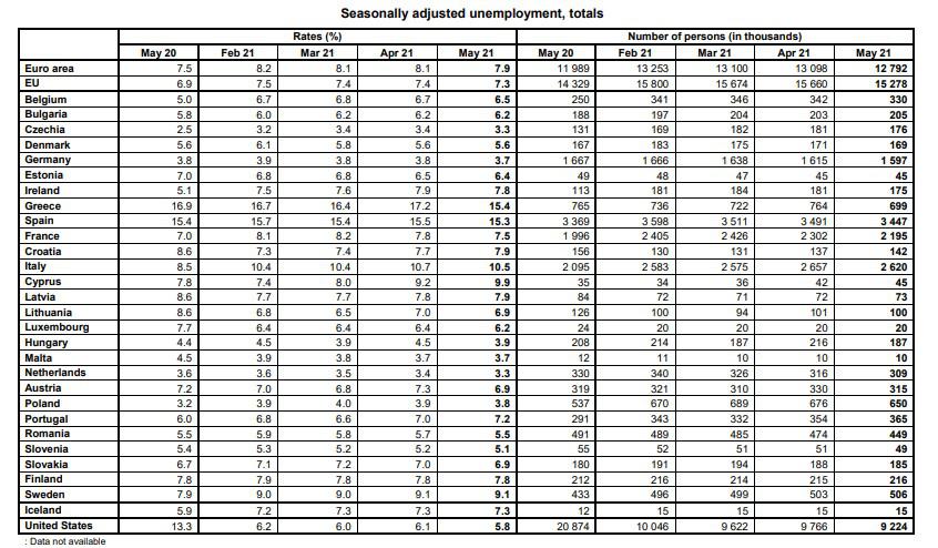 Τον Μάιο του 2021, το ποσοστό ανεργίας στην ευρωζώνη μειώθηκε στο 7,9%, από 8,1% τον Απρίλιο, ενώ στην ΕΕ η ανεργία μειώθηκε στο 7,3%, από 7,4% τον Απρίλιο. Τον Μάιο του 2020, η ανεργία στην ευρωζώνη και στην ΕΕ ήταν 7,5% και 6,9%, αντιστοίχως.