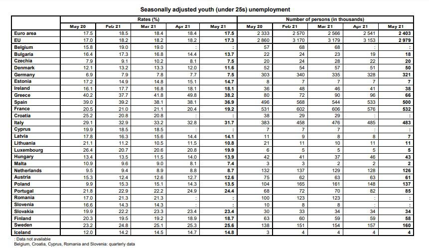 Το ποσοστό ανεργίας των νέων (κάτω των 25 ετών), τον Μάιο του 2021 ήταν 17,3% στην ΕΕ και 17,5% στη ζώνη του ευρώ, μειωμένο από 18,2% και 18,4% αντιστοίχως τον προηγούμενο μήνα.