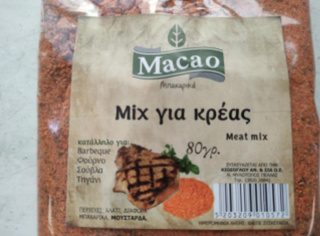 Ο Ε.Φ.Ε.Τ. και ειδικότερα η Περιφερειακή Διεύθυνση Κεντρικής Μακεδονίας, κατά τη διενέργεια ελέγχων στο πλαίσιο του Προγράμματος «Επίσημος Έλεγχος για την παρουσία αλλεργιογόνων ουσιών σε ορισμένα είδη τροφίμων» έτους 2021, προέβη σε δειγματοληψία τροφίμου με στοιχεία: «ΜΙΓΜΑ ΜΠΑΧΑΡΙΚΩΝ» με την επωνυμία MACAO MIX ΓΙΑ ΚΡΕΑΣ, με ημερομηνία ανάλωσης κατά προτίμηση 12/2024 και αριθμό παρτίδας LOT 2005 προέλευσης Ε.Ε. σε διαφανή περιέκτη των 80 γραμμαρίων που συσκευάζεται και διανέμεται στην Ελλάδα από την ΚΙΟΣΟΓΛΟΥ ΑΝ. & ΣΙΑ Ο.Ε.- «MACAO» με έδρα τον Νέο Μυλότοπο Π.Ε. Πέλλας.