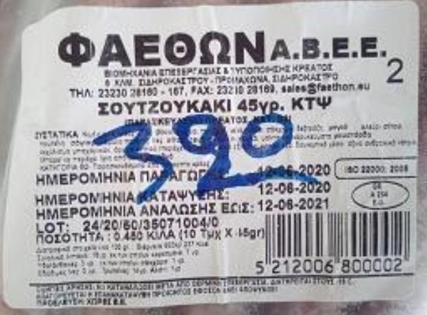 Ο Ε.Φ.Ε.Τ. και ειδικότερα η Περιφερειακή Διεύθυνση Κεντρικής Μακεδονίας, κατά τη διενέργεια ελέγχων στο πλαίσιο του Προγράμματος «Επίσημος Έλεγχος Μικροβιολογικών Κριτηρίων Ασφάλειας Τροφίμων» έτους 2020, προέβη σε δειγματοληψία παρασκευάσματος κρέατος με τα στοιχεία: ΣΟΥΤΖΟΥΚΑΚΙ 45 γρ. ΚΤΨ, αριθμού παρτίδας lot 24/20/50/35071004/0, με ημερομηνία ανάλωσης 12/06/2021 και ημερομηνία παραγωγής / κατάψυξης 12/06/2020, που παράγεται από την εταιρεία «ΦΑΕΘΩΝ Α.Β.Ε.Ε.» και σε συνεργασία με τα Εργαστήρια Δοκιμών και Ερευνών Τροφίμων Θεσσαλονίκης του Ε.Φ.Ε.Τ., διαπιστώθηκε η ΠΑΡΟΥΣΙΑ του παθογόνου μικροοργανισμού Salmonella spp. στο ανωτέρω δείγμα.