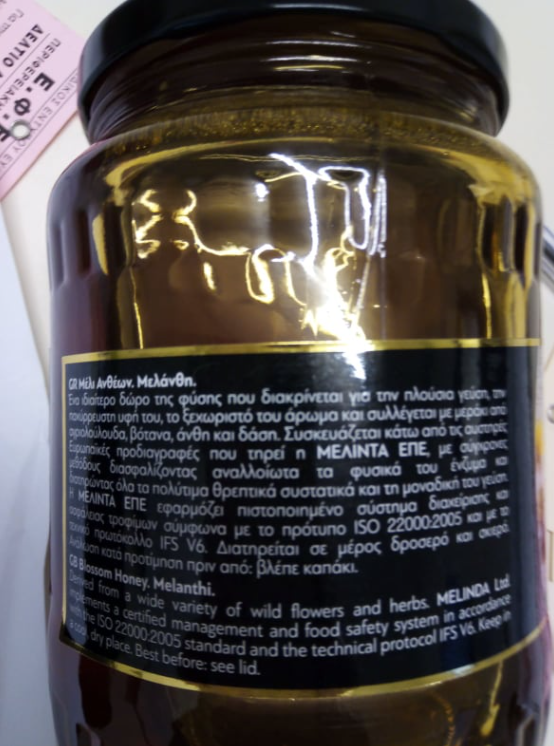 Μέλι ανθέων, εμπορικής ονομασίας «ΜΕΛΑΝΘΗ», καθαρού βάρους 900g, με αριθμό παρτίδας LΟΤ 200425 και ημερομηνία λήξης 25/04/2022. Το ανωτέρω προϊόν συσκευάζεται από την επιχείρηση «ΜΕΛΙΝΤΑ Ε.Π.Ε.», ενώ ελήφθη από το υποκατάστημα της επιχείρησης «ΛΙΝΤΛ ΕΛΛΑΣ ΚΑΙ ΣΙΑ ΟΕ», Χρήστου Μπέκα και Ηλία Μπερτόλη, Τ. Κ 19004 ΣΠΑΤΑ – ΑΤΤΙΚΗ.