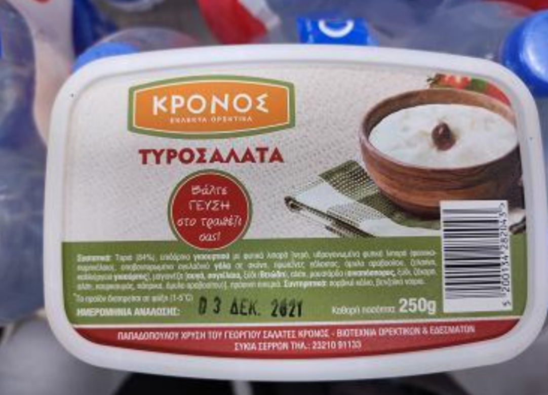 Ο Ε.Φ.Ε.Τ. και ειδικότερα η Περιφερειακή Διεύθυνση Κεντρικής Μακεδονίας, κατά τη διενέργεια ελέγχων στο πλαίσιο του επίσημου ελέγχου έτους 2021 για την παρακολούθηση των επιπέδων των προσθέτων», προέβη σε δειγματοληψία τυροσαλάτας με τα παρακάτω στοιχεία: «ΤΥΡΟΣΑΛΑΤΑ ΚΡΟΝΟΣ», βάρους 250 γρ., ημερομηνία ανάλωσης 03 ΔΕΚ. 2021, εταιρεία παρασκευής «ΠΑΠΑΔΟΠΟΥΛΟΥ ΧΡΥΣΗ – ΣΑΛΑΤΕΣ ΚΡΟΝΟΣ», που βρίσκεται στη Συκιά Σερρών.