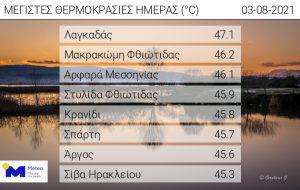 Συνθήκες καύσωνα επικράτησαν και τη Τρίτη 03/08 σε ολόκληρη τη χώρα. Σύμφωνα με το δίκτυο αυτόματων μετεωρολογικών σταθμών του Εθνικού Αστεροσκοπείου Αθηνών/meteo.gr ο υδράργυρος έφτασε ή ξεπέρασε τους 40 βαθμούς Κελσίου σε 205 σταθμούς (Γράφημα 1), τους 43 βαθμούς Κελσίου σε 59 σταθμούς, ενώ η απολύτως μέγιστη θερμοκρασία ήταν 47.1 βαθμοί Κελσίου στο Λαγκαδά, Θεσσαλονίκης. Αξιοσημείωτο ειναι το γεγονός οτι η θερμοκρασία ξεπέρασε για δεύτερη συνεχόμενη ημέρα τους 46 βαθμούς Κελσίου στο δίκτυο αυτόματων μετεωρολογικών σταθμών του Εθνικού Αστεροσκοπείου Αθηνών/meteo.gr. Οι περιοχές όπου καταγράφηκαν οι οκτώ υψηλότερες μέγιστες παρουσιάζονται στον πίνακα που ακολουθεί.