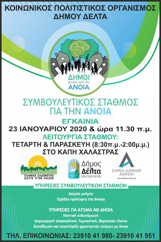 Ο δήμος Δέλτα αποκτά ειδικό συμβουλευτικό σταθμό για την Άνοια με σκοπό να βοηθήσει τους δημότες να πληροφορηθούν για τη νόσο και με τη βοήθεια των επιστημόνων να καταφέρουν την έγκαιρη διάγνωση και την αντιμετώπιση της.
