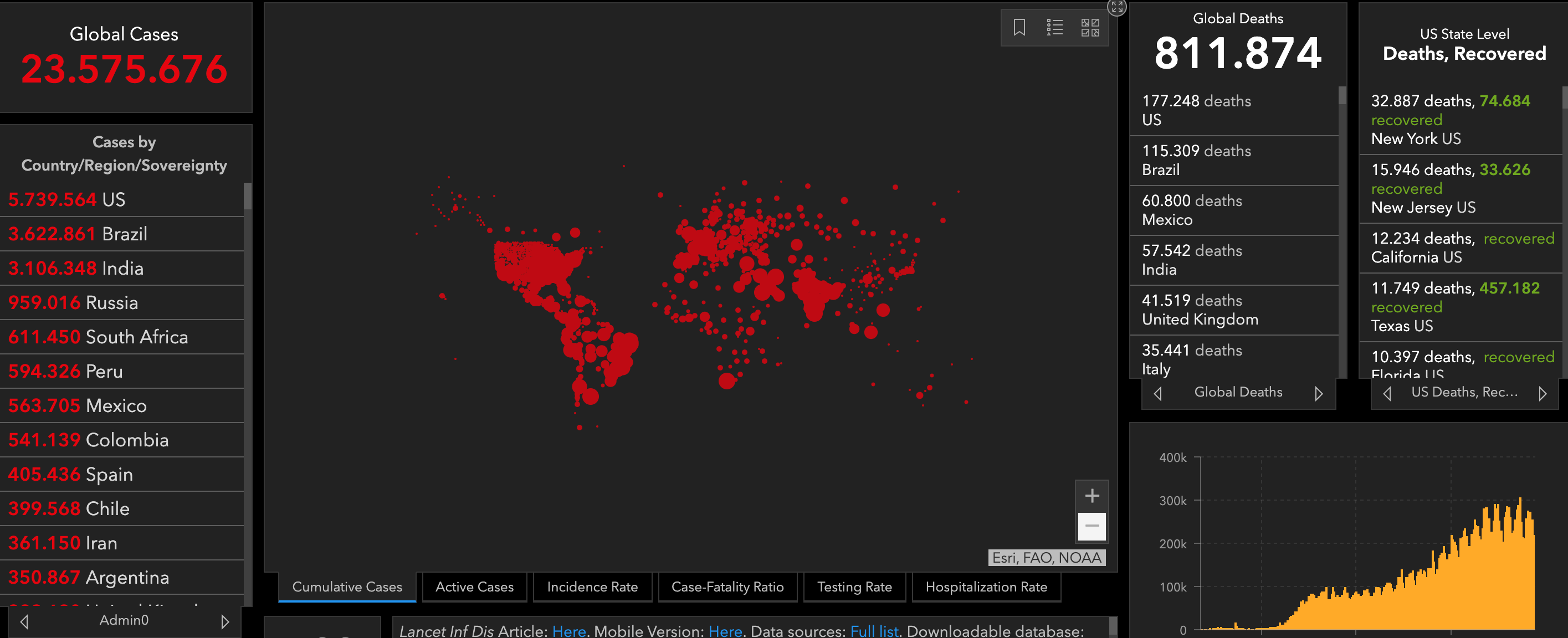 Περισσότεροι από 23,65 εκατ. άνθρωποι έχουν επιβεβαιωμένα μολυνθεί από τον νέο κορονοϊό σε όλο τον κόσμο και 811.895 έχουν πεθάνει, σύμφωνα με καταμέτρηση του Reuters εώς σήμερα.