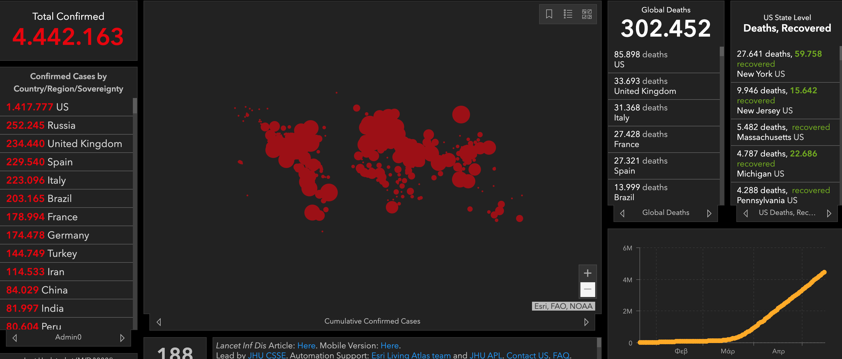 Ως χθες Πέμπτη στις 20:30 (τοπική ώρα· 03.30 ώρα Ελλάδας) από την ίδια ώρα της προηγουμένης, καταγράφηκαν 1.754 νέοι θάνατοι εξαιτίας του COVID-19. Οι ΗΠΑ είναι η χώρα που θρηνεί τα περισσότερα θύματα εξαιτίας της πανδημίας στον κόσμο σε απόλυτο αριθμό: 85.813 νεκρούς. Πάντως με βάση την αναλογία θανάτων προς τον πληθυσμό, οι ΗΠΑ θρηνούν λιγότερα θύματα της ασθένειας από χώρες της Ευρώπης, όπως η Γαλλία, η Ισπανία, η Ιταλία και το Ηνωμένο Βασίλειο.