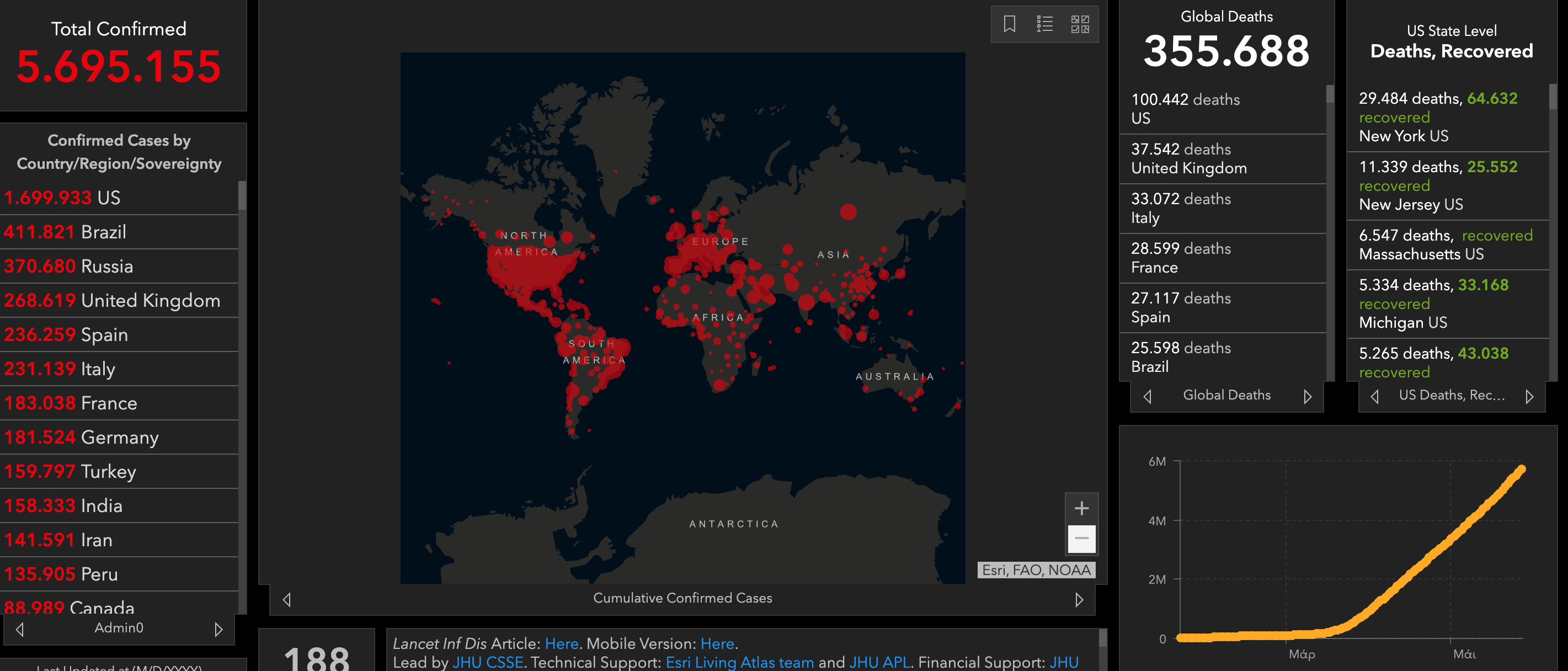 Μέχρι τις 22.00 χθες είχαν καταγραφεί περισσότερα από 5.638.190 επιβεβαιωμένα κρούσματα σε 196 χώρες και εδάφη. Ο αριθμός αυτός των διαγνωσμένων μολύνσεων, ωστόσο, αντανακλά μόνο ένα κλάσμα του πραγματικού αριθμού λοιμώξεων, με μεγάλο αριθμό χωρών να εξετάζουν μόνο τα κρούσματα που απαιτούν νοσοκομειακή περίθαλψη. Τουλάχιστον 2.236.200 από αυτούς τους ασθενείς έχουν πλέον αναρρώσει.
