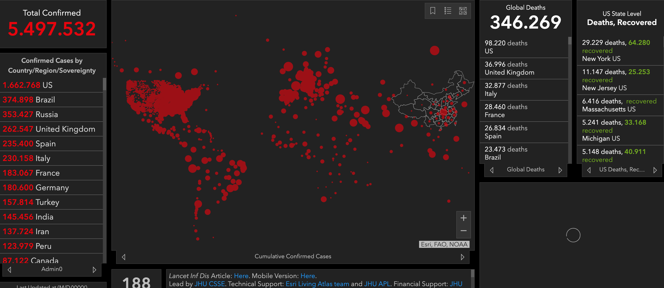 Μέχρι τις 22.00 χθες είχαν καταγραφεί περισσότερα από 5.453.650 επιβεβαιωμένα κρούσματα σε 196 χώρες και εδάφη. Ο αριθμός αυτός των διαγνωσμένων μολύνσεων, ωστόσο, αντανακλά μόνο ένα κλάσμα του πραγματικού αριθμού λοιμώξεων, με μεγάλο αριθμό χωρών να εξετάζουν μόνο τα κρούσματα που απαιτούν νοσοκομειακή περίθαλψη. Τουλάχιστον 2.133.900 από αυτούς τους ασθενείς έχουν πλέον αναρρώσει.