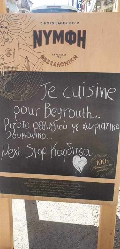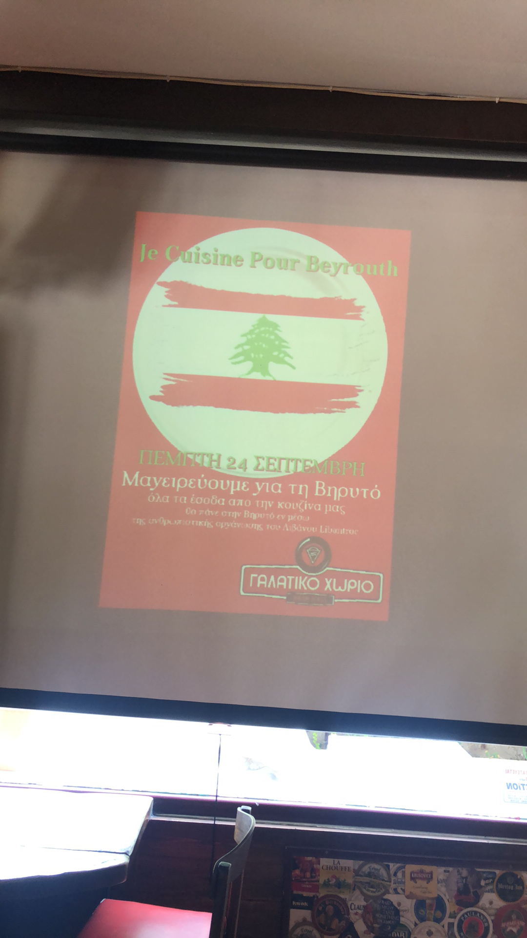 Και φυσικά οι γονείς, κάτι πρέπει να κάνουμε. Κατευθείαν έκανα δύο τηλέφωνα σε δύο πολύ γλυκούς ανθρώπους ο ένας σαν τη γλυκιά μπουγάτσα πού κάνει και ο δεύτερος ένας φίλος χρόνια και άνθρωπος με ευαισθησία μεγάλη ,έχοντας βέβαια γνώση ότι η εστίαση ειδικά αυτό τον καιρό είναι ημιθανής, αμέσως σκέφτηκα ένα δύσκολο όνομα το jecuisiniepourBeyrouth και έκανα ένα πρόχειρο σήμα (αυτό πού έχουμε) και το ανέβασα στα μέσα δικτύωσης.