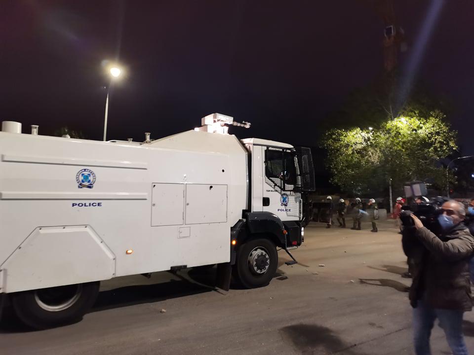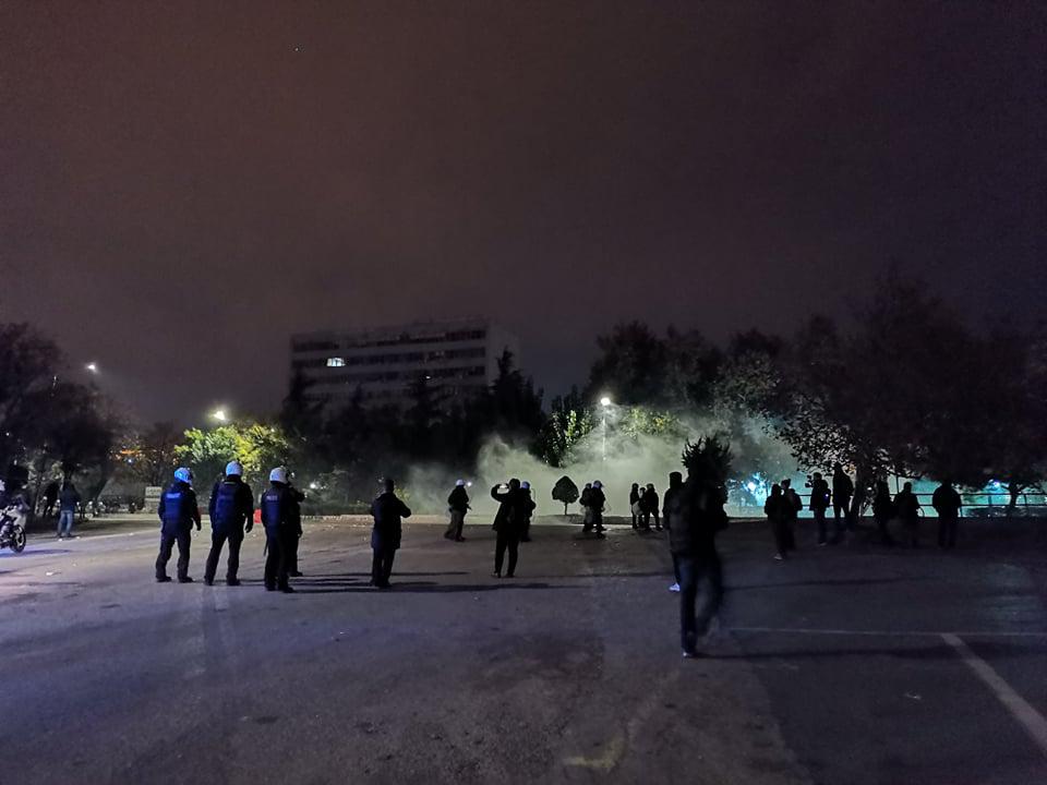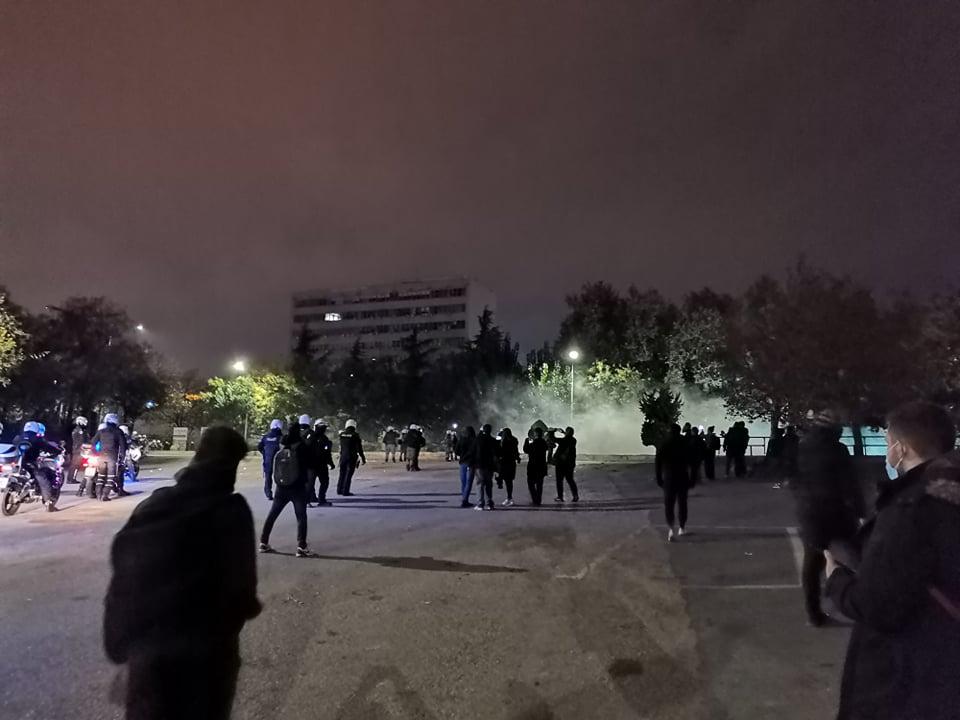 UPD 21:10 Πλησίασε και η αύρα της αστυνομίας, για ρίψη νερού ενώ στο εσωτερικό της Πολυτεχνικής Σχολής και του ΑΠΘ παραμένουν ομάδες νεαρών που πετούν πέτρες προς τις αστυνομικές δυνάμεις οι οποίες απαντούν με βόμβες κρότου – λάμψης προκειμένου να τους απωθήσουν. Επίσης έξω από το Πολυτεχνείο υπάρχει και ομάδα ΔΙΑΣ της ΕΛΑΣ.