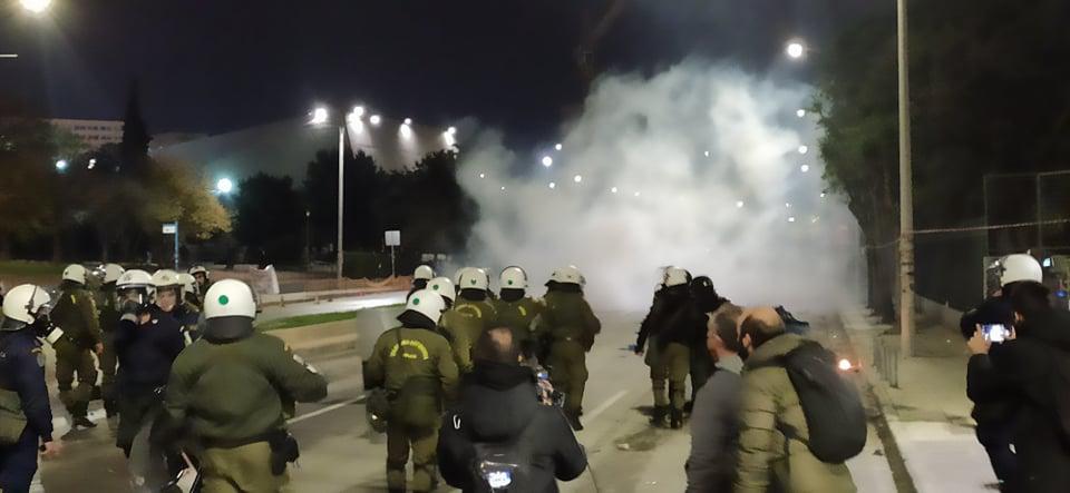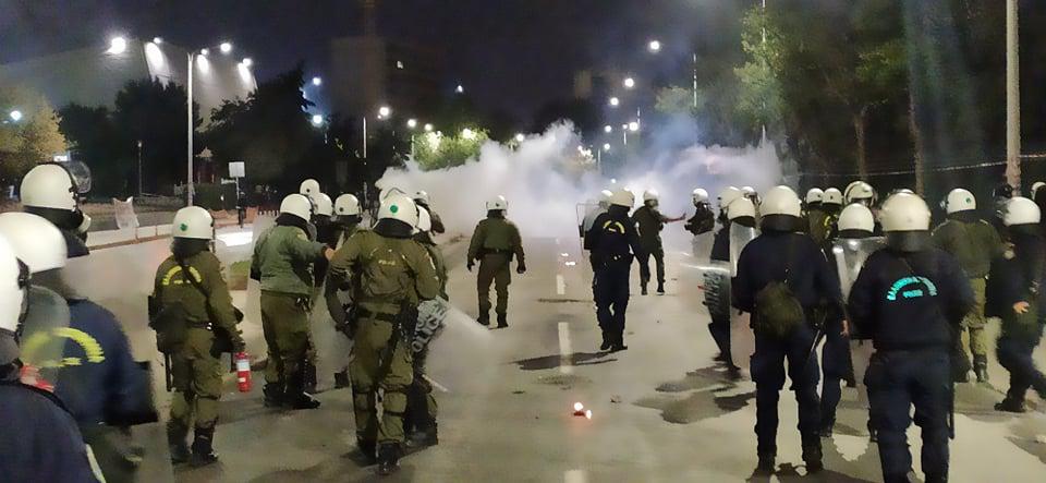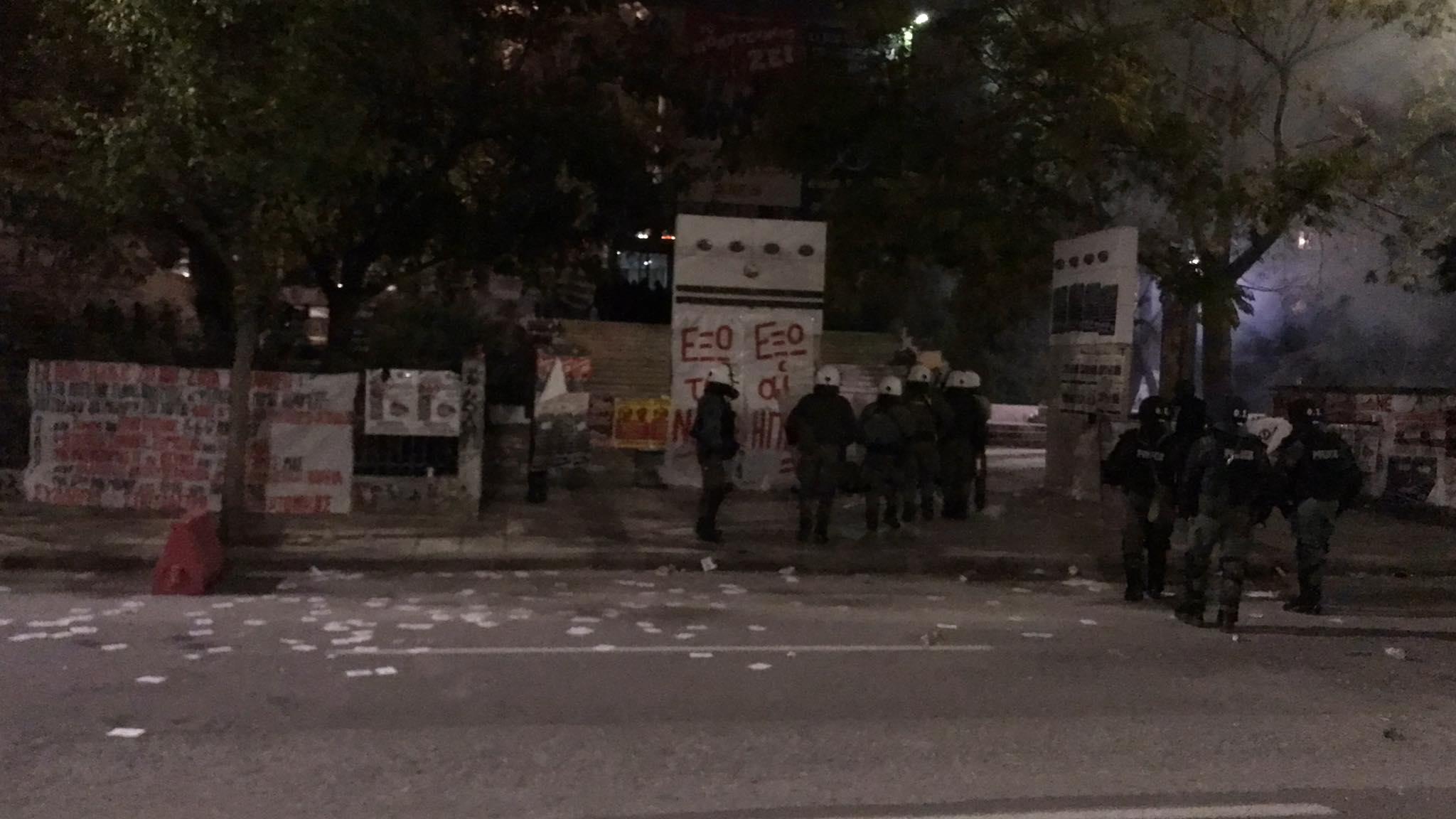 Οι αστυνομικοί αντέδρασαν με καπνογόνα και βόμβες κρότου λάμψης ενώ από η πλευρά των αναρχικών απάντησε με ρίψει μολότοφ. Αυτή την ώρα η σύγκρουση έχει μεταφερθεί προς το Πολυτεχνείο όπου καίγονται κάδοι σκουπιδιών και πλαστικά διαχωριστικά των δρόμων. Ομάδες αναρχικών έχουν οχυρωθεί στο Πολυτεχνείο και απέξω έχουν προσεγγίσει άνδρες των ΜΑΤ.