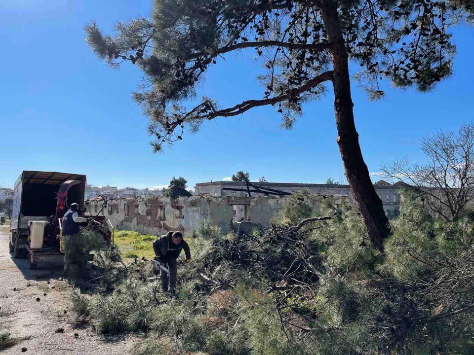 Από την επιβλητική αλέα των πολύ ψηλών πεύκων ηλικίας άνω των 50 ετών στην κύρια είσοδο του πρώην στρατοπέδου Παύλου Μελά, απέναντι από το Δημαρχείο, ξεκίνησαν τα κλαδέματα, από πιστοποιημένο συνεργείο, εξειδικευμένο στις κλαδεύσεις υψηλών και επικίνδυνων δένδρων.