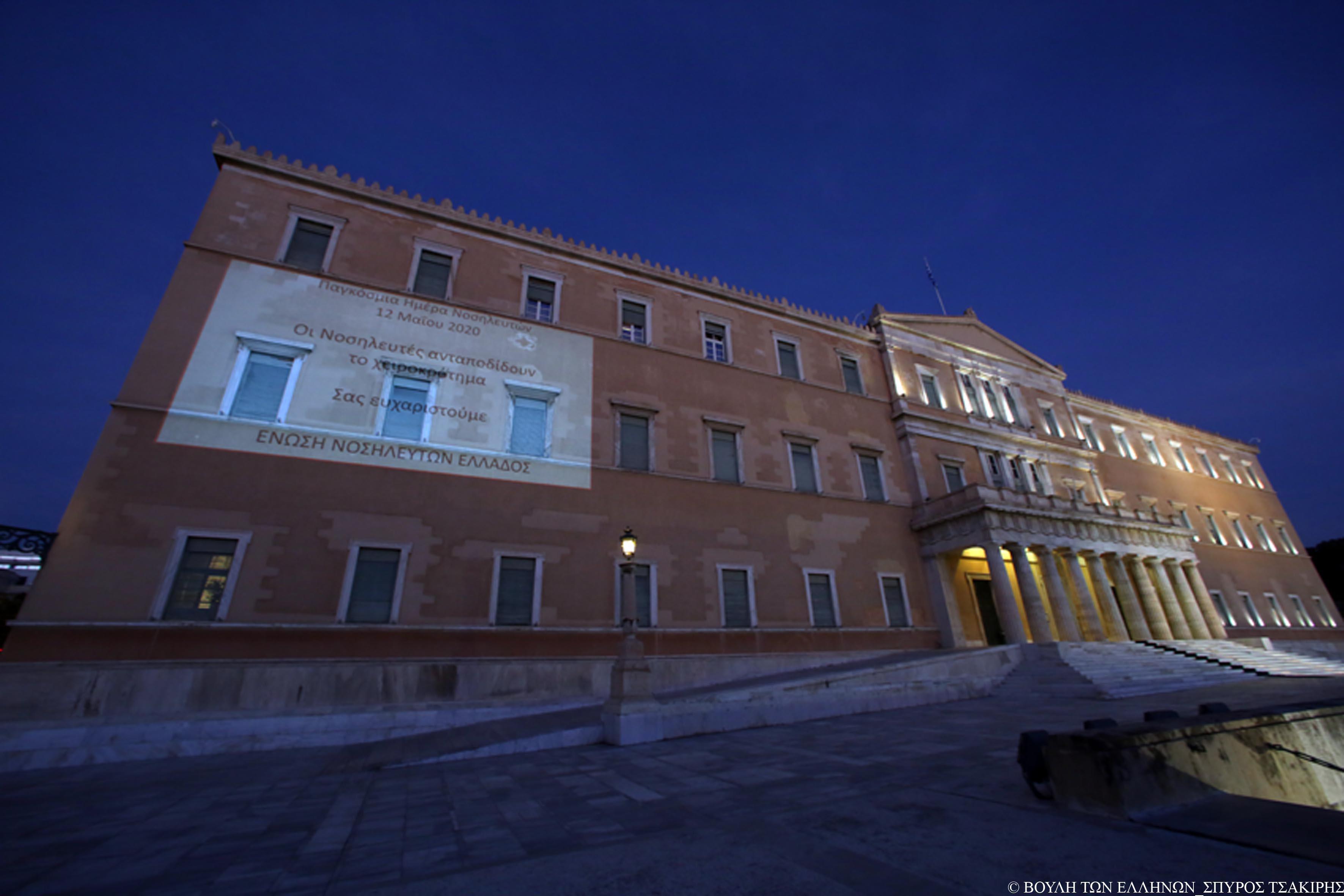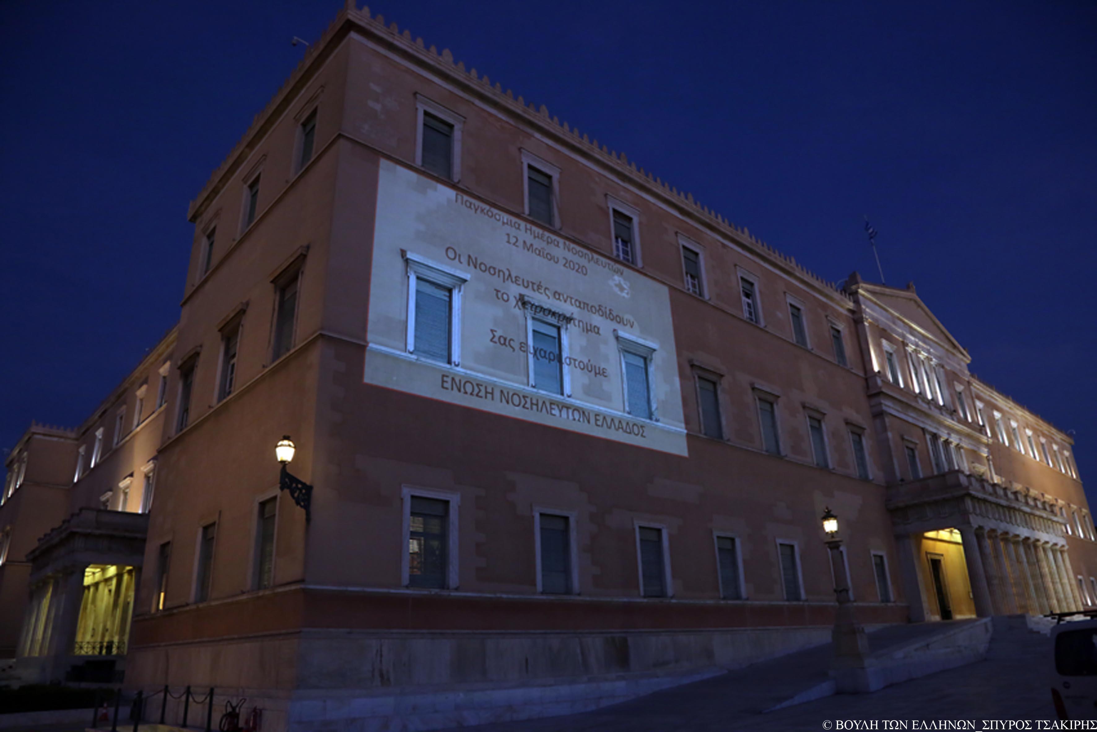 Τιμώντας την Παγκόσμια Ημέρα Νοσηλευτών, όπως έχει ορισθεί η 12η Μαΐου, η Βουλή των Ελλήνων, με απόφαση του Προέδρου της κ. Κωνσταντίνου Τασούλα, φωταγώγησε χθες το βράδυ την πρόσοψη του κτηρίου της με το λογότυπο της Ένωσης Νοσηλευτών Ελλάδας.