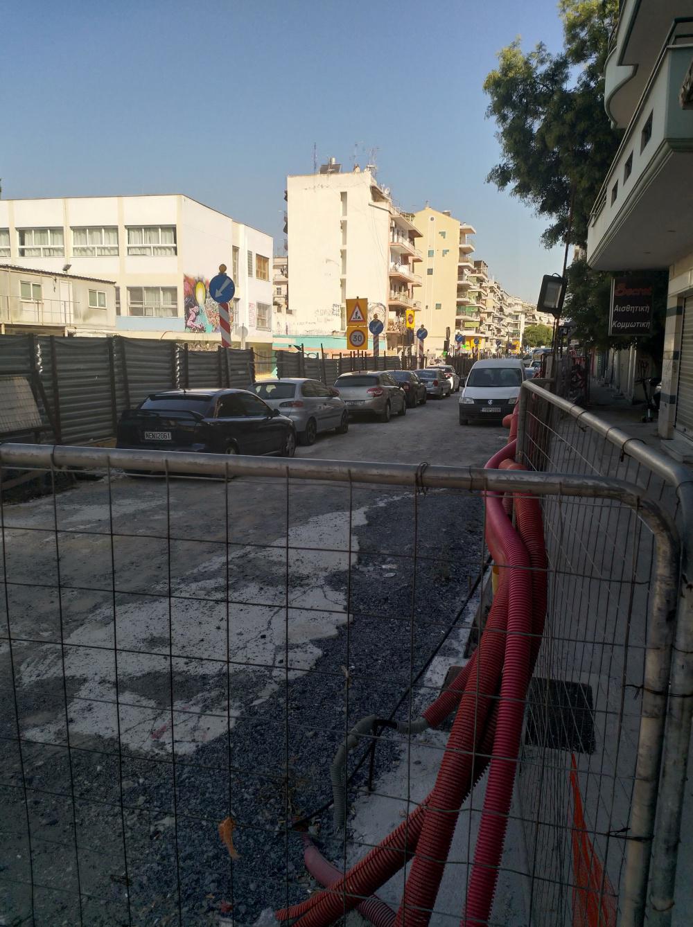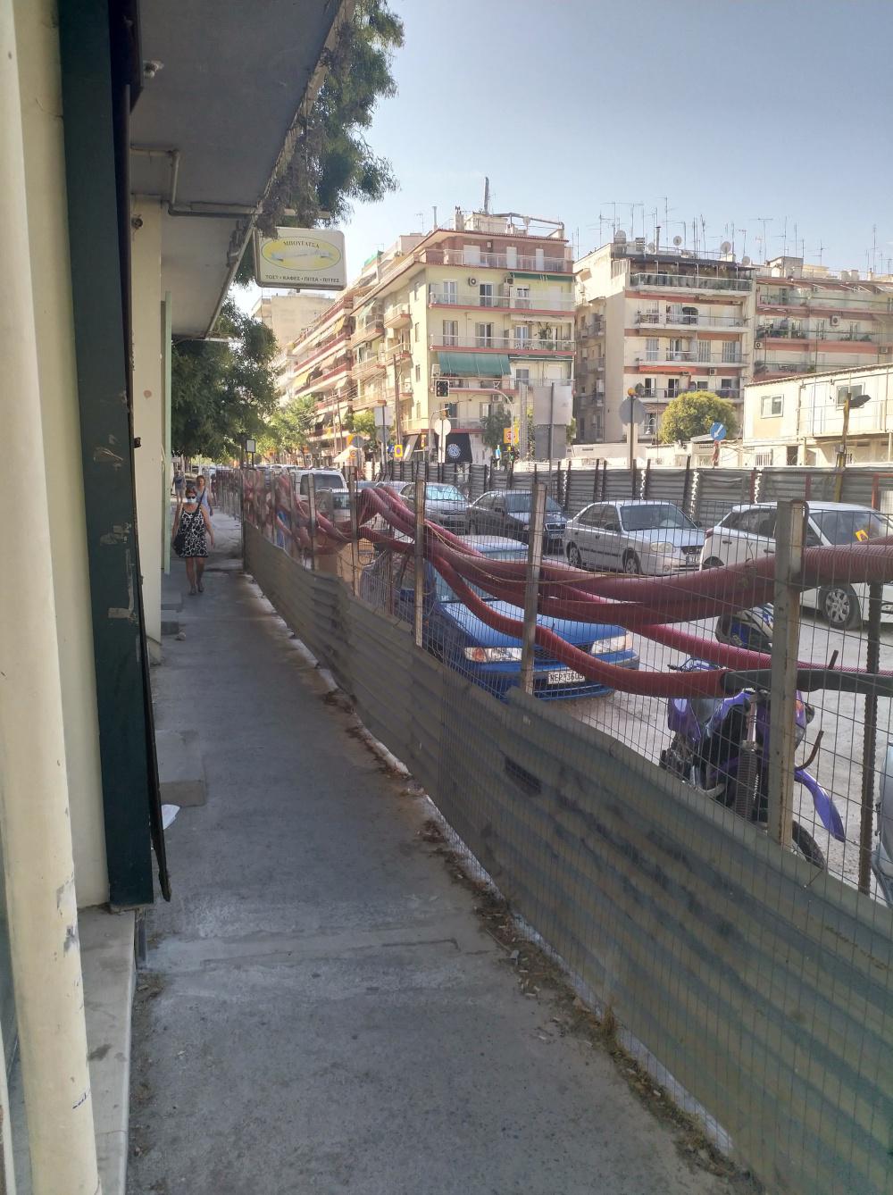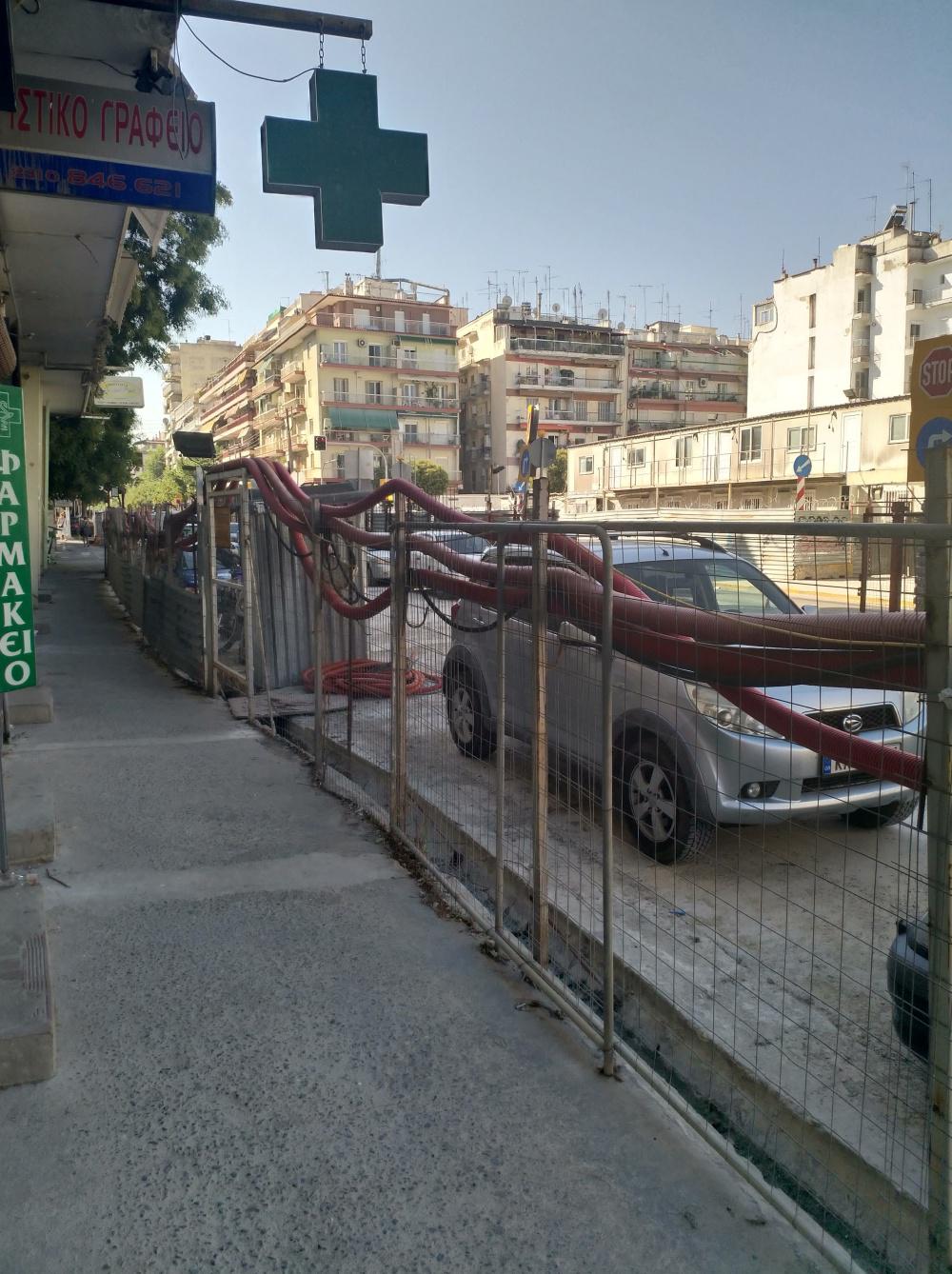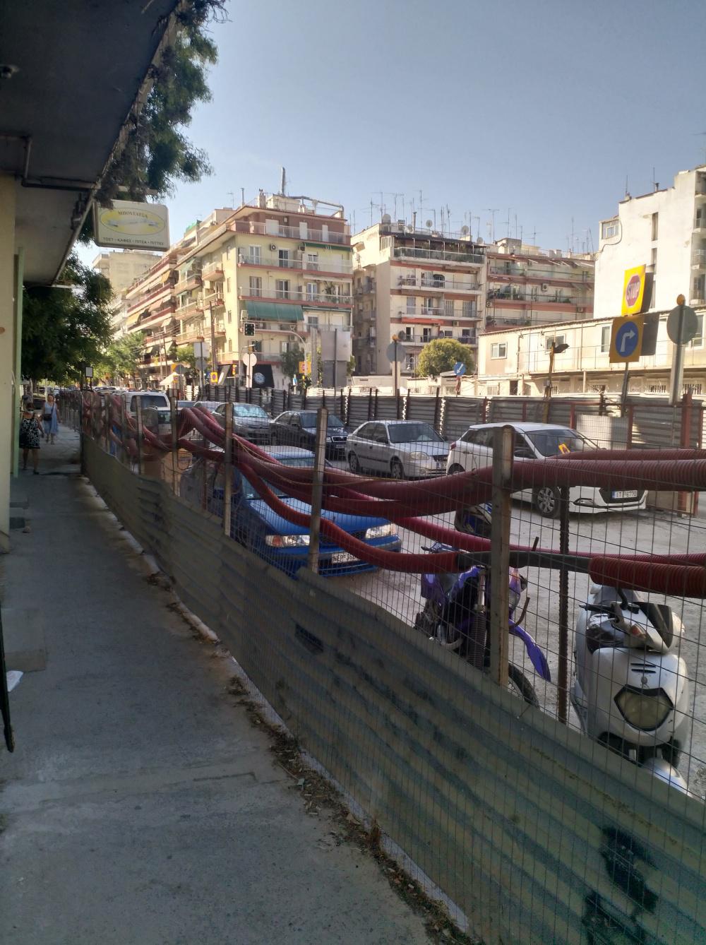 Οι εικόνες είναι από το “εργοτάξιο” του μετρό Θεσσαλονίκης στη συμβολή των οδών Δελφών και Πέτρου Συνδικα. Ένα μεγάλο κομμάτι της επιφάνειας του, σχεδόν δύο οικοδομικά τετράγωνα, επί τής Δελφών έχει μετατραπεί σε πάρκινγκ.
