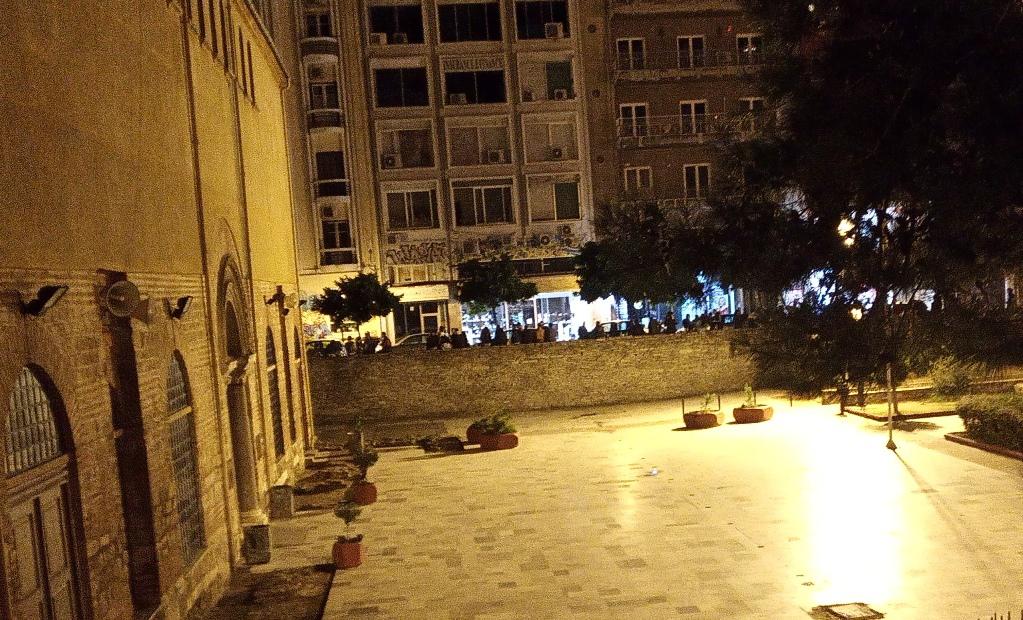 Στην πλατεία Αγίας Σοφίας, στον πεζόδρομο της Ικτίνου και στο κάτω πεζούλι του Ναού της του Θεού Σοφίας, όπου συνήθως τα βράδια μαζεύονται εκατοντάδες νέοι και νέες, το σκηνικό ήταν σχεδόν απόκοσμο. Μερικές δεκάδες νεαροί παρέμειναν και μετά τη 1 το πρωί πέριξ του ναού, κυρίως κοντά στην είσοδο και στο πεζούλι της εκκλησίας ενώ όλοι οι γύρω δρόμοι, και η πλατεία, ήταν απόλυτα άδειοι. Η ίδια εικόνα και στην πλατεία Αρχαίας Αγοράς όπου συνήθως, τις ημέρες της «κανονικότητας», «αράζουν» εκατοντάδες νέοι και νέες με ένα κουτί μπύρα στο χέρι. Περίπου 20 – 30 άτομα δεν μπορούσαν να διασπάσουν το έρημο τοπίο της μεγάλη πλατείας, που έδειχνε τη μεγαλοπρέπεια της χωρίς την παρουσία ανθρώπων και αυτοκινήτων.