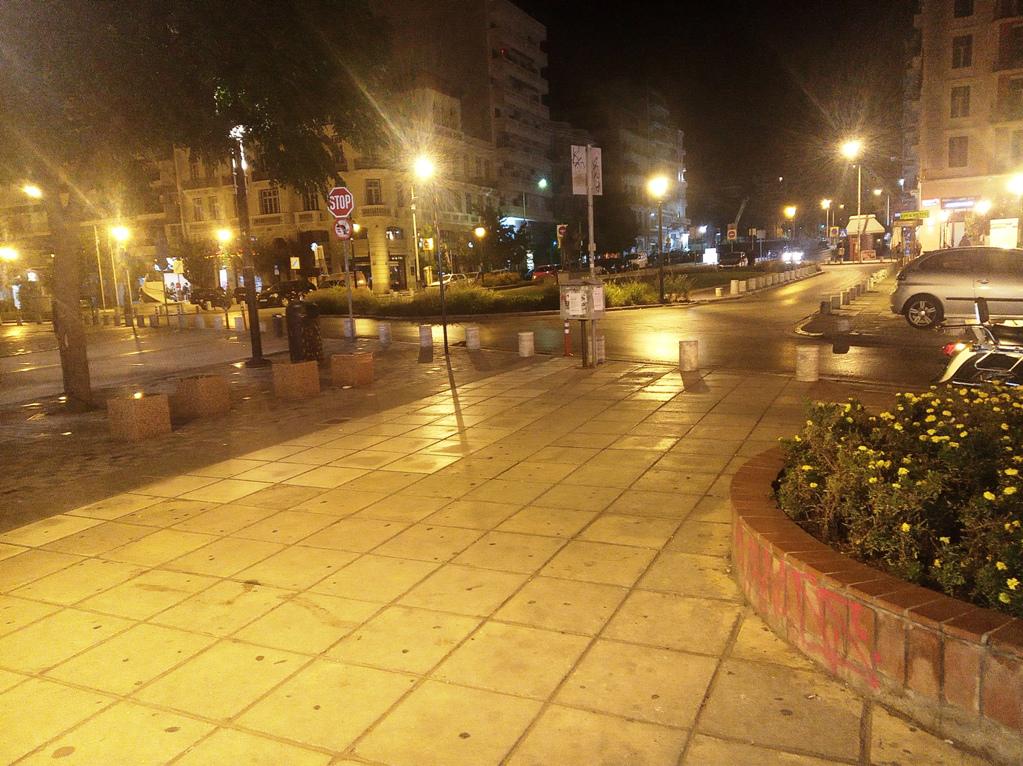 Γύρω στα μεσάνυχτα, ήδη η κίνηση στο κέντρο της πόλης ήταν περιορισμένη, αν όχι ελάχιστη. Στην πλατεία Ναυαρίνου και στη Δημητρίου Γούναρη, τα καφέ και τα φαστφουντάδικα είχαν αρχίσει να αδειάζουν όπως και στην Παύλου Μελά, στην Ικτίνου, στην Αγίας Σοφίας και στην Αριστοτέλους. Το χαρακτηριστικό ήταν μία παράξενη ησυχία λόγω των περιοριστικών μέτρων που απαγορεύουν τη μουσική. Το να ακούς μόνο ανθρώπινες φωνές είναι σχεδόν σπάνιο στο κέντρο της πόλης. Η μόνη παραφωνία ήταν ο θόρυβος των αυτοκινήτων και των δίκυκλων, που όσο πλησίασε η ώρα της απαγόρευσης της κυκλοφορίας σταδιακά μειωνόταν.